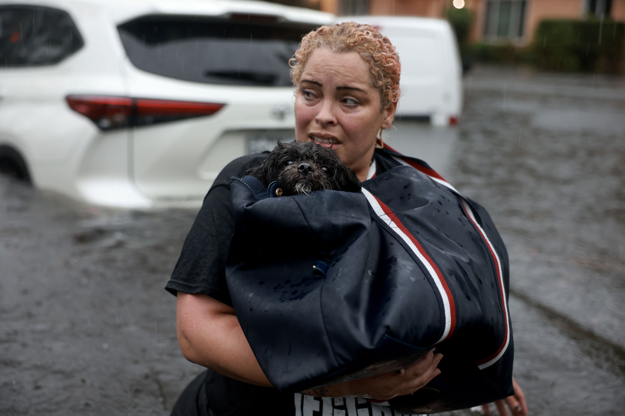 Iraida Rodriguez carries her dog, Benji, as she evacuates from her flooded home on June 12, 2024, in Hollywood, Florida. As tropical moisture passes through the area, areas have become flooded due to the heavy rain. (Photo by Joe Raedle/Getty Images)