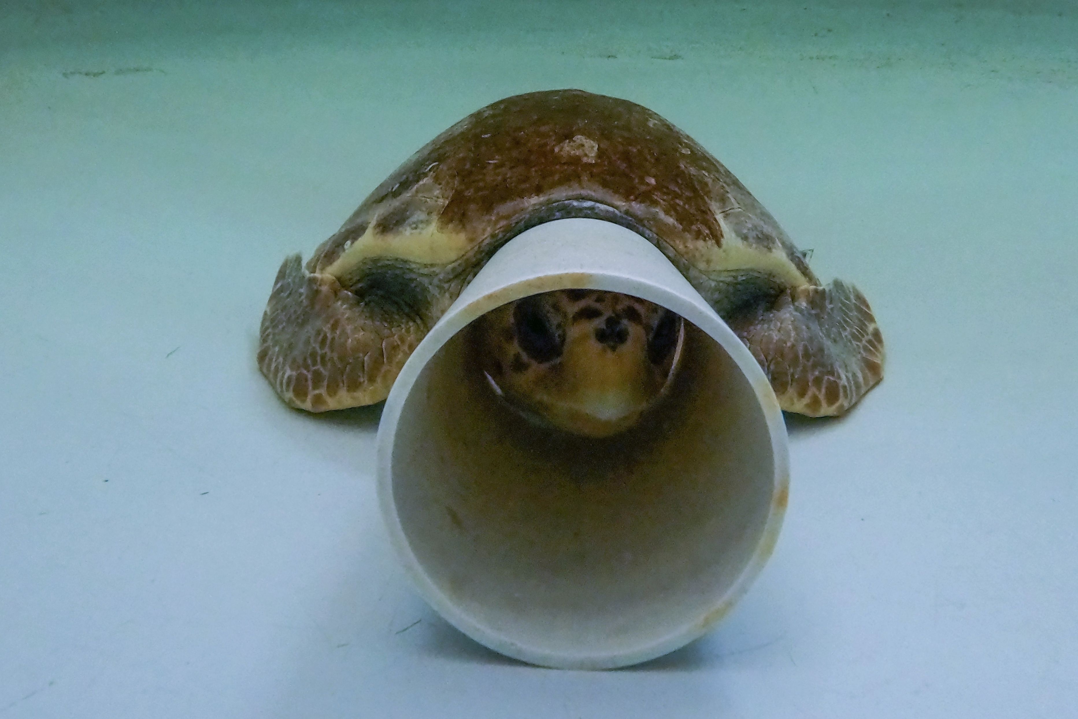 A sea turtle named Vesuvio sleeps underwater in a tank at CESTHA, the Experimental Center for the Protection of Habitats, inside a former market in Marina di Ravenna, on the Adriatic Sea, Italy, Saturday, June 8, 2024. The small plastic cone protects the turtles from light as they sleep or nap. (Photo by Luca Bruno/AP Photo)