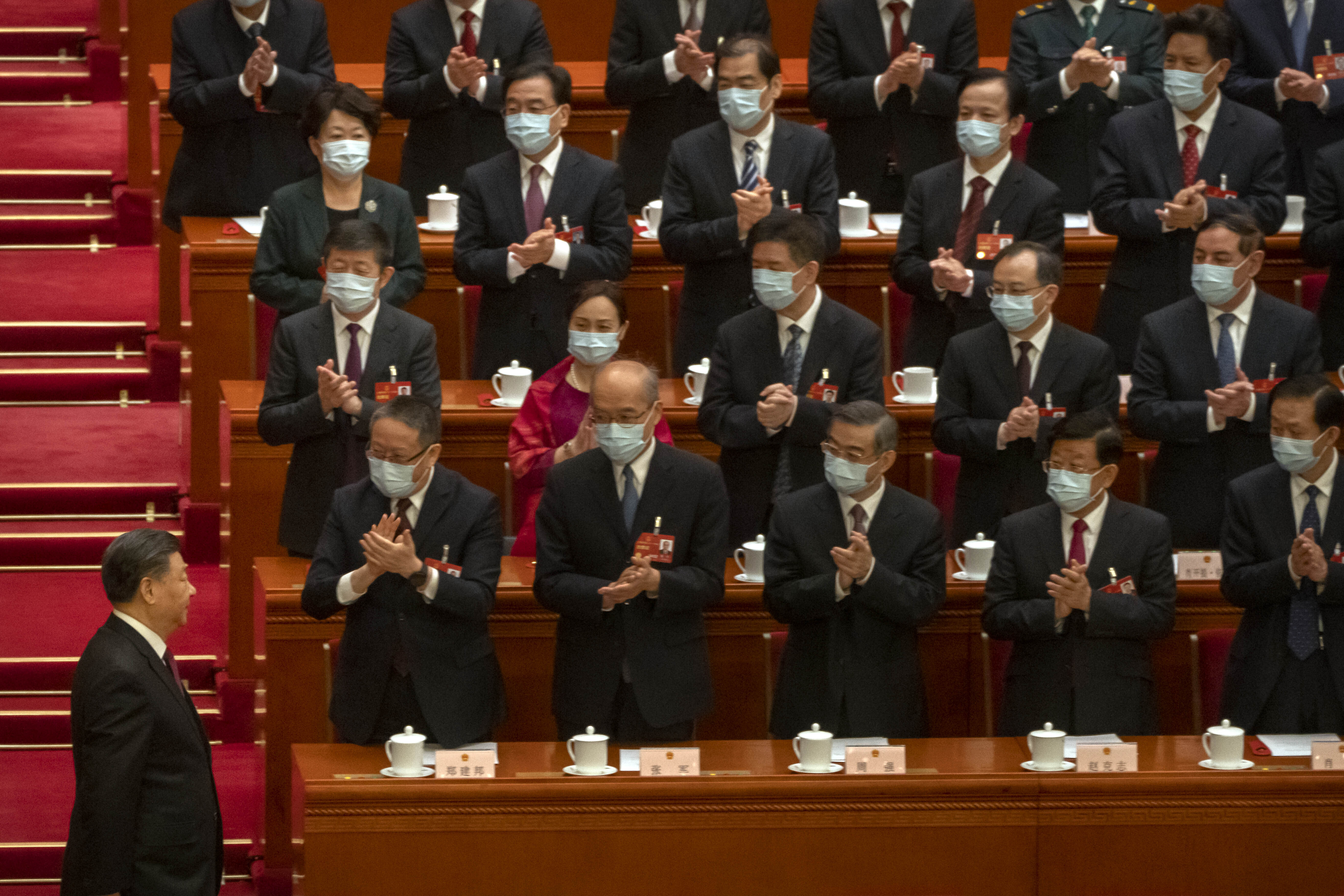 Delegates applaud as Chinese President Xi Jinping arrives for a session of China's National People's Congress (NPC) at the Great Hall of the People in Beijing, Friday, March 10, 2023. Chinese leader Xi Jinping was awarded a third five-year term as president Friday, putting him on track to stay in power for life at a time of severe economic challenges and rising tensions with the U.S. and others. (Photo by Mark Schiefelbein/AP Photo)
