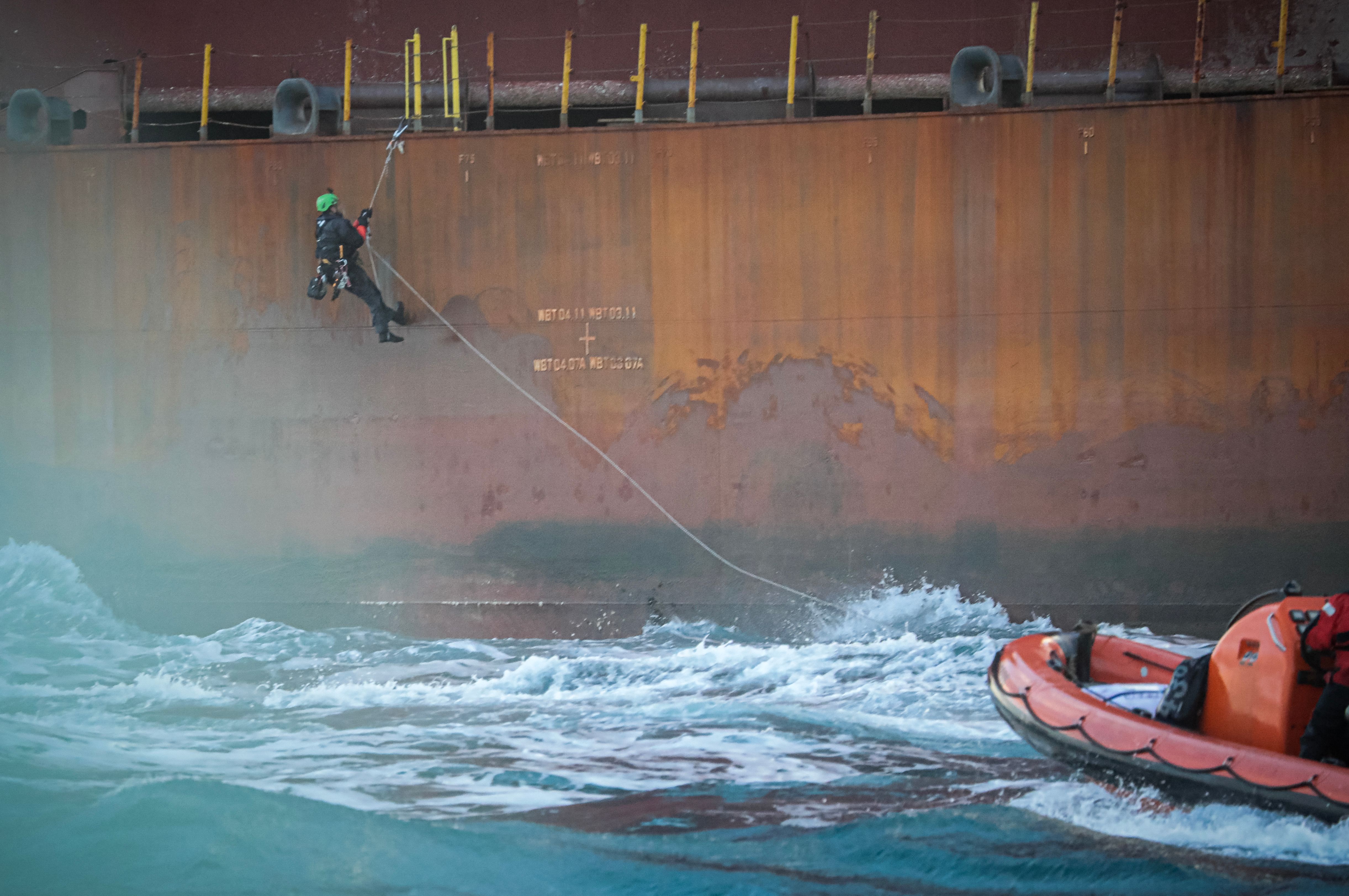 An activist of the environmental NGO Greenpeace climbs to take part in an action on a Shell platform, on the way to the North Sea, to expand an existing oil and gas field, off the coast of Cherbourg, northwestern France, on February 6, 2023. (Photo by Lou Benoist/AFP Photo)