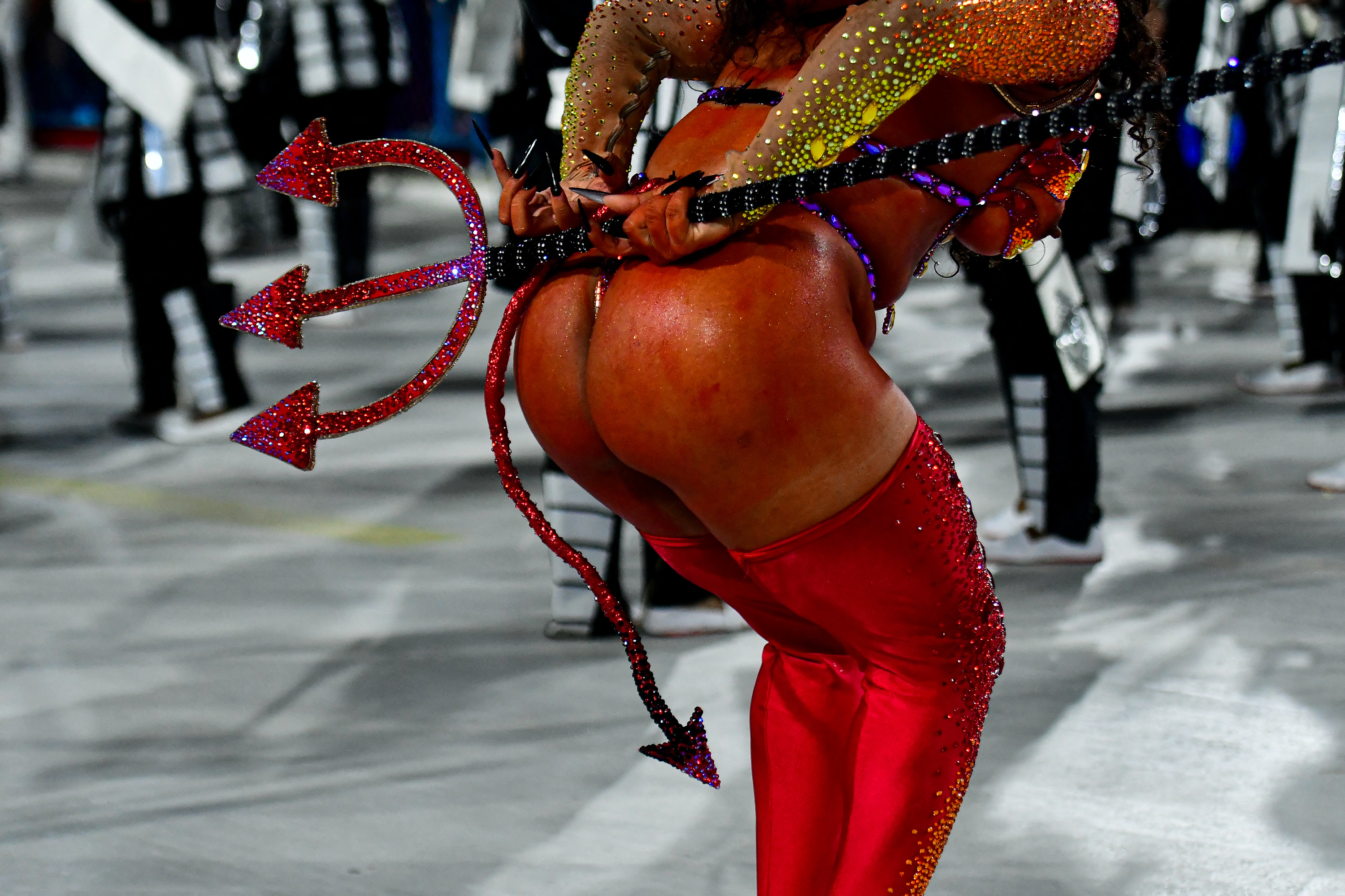 Lili Tudao Drum Queen of the Unidos da Ponte Samba School during a performance at the Gold Series parade in Rio de Janeiro at the Marques Sambadrome of Sapucai this Saturday, February 18, 2023. (Photo by Thiago Ribeiro/AGIF via AFP Photo)