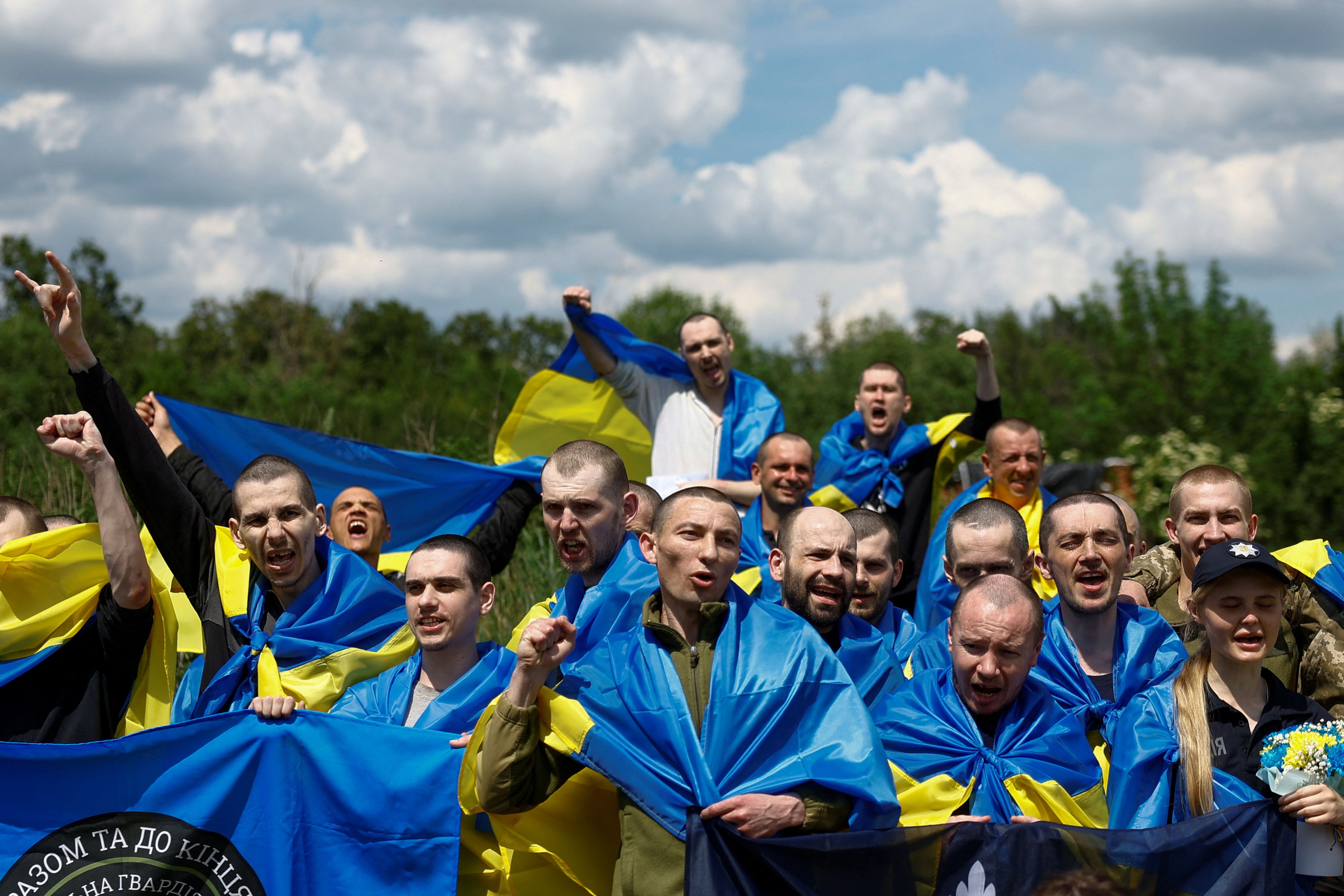 Ukrainian prisoners of war (POWs) shout slogans while they pose for a picture after a swap, amid Russia's attack on Ukraine, at an unknown location in Ukraine on May 31, 2024. (Photo by Valentyn Ogirenko/Reuters)