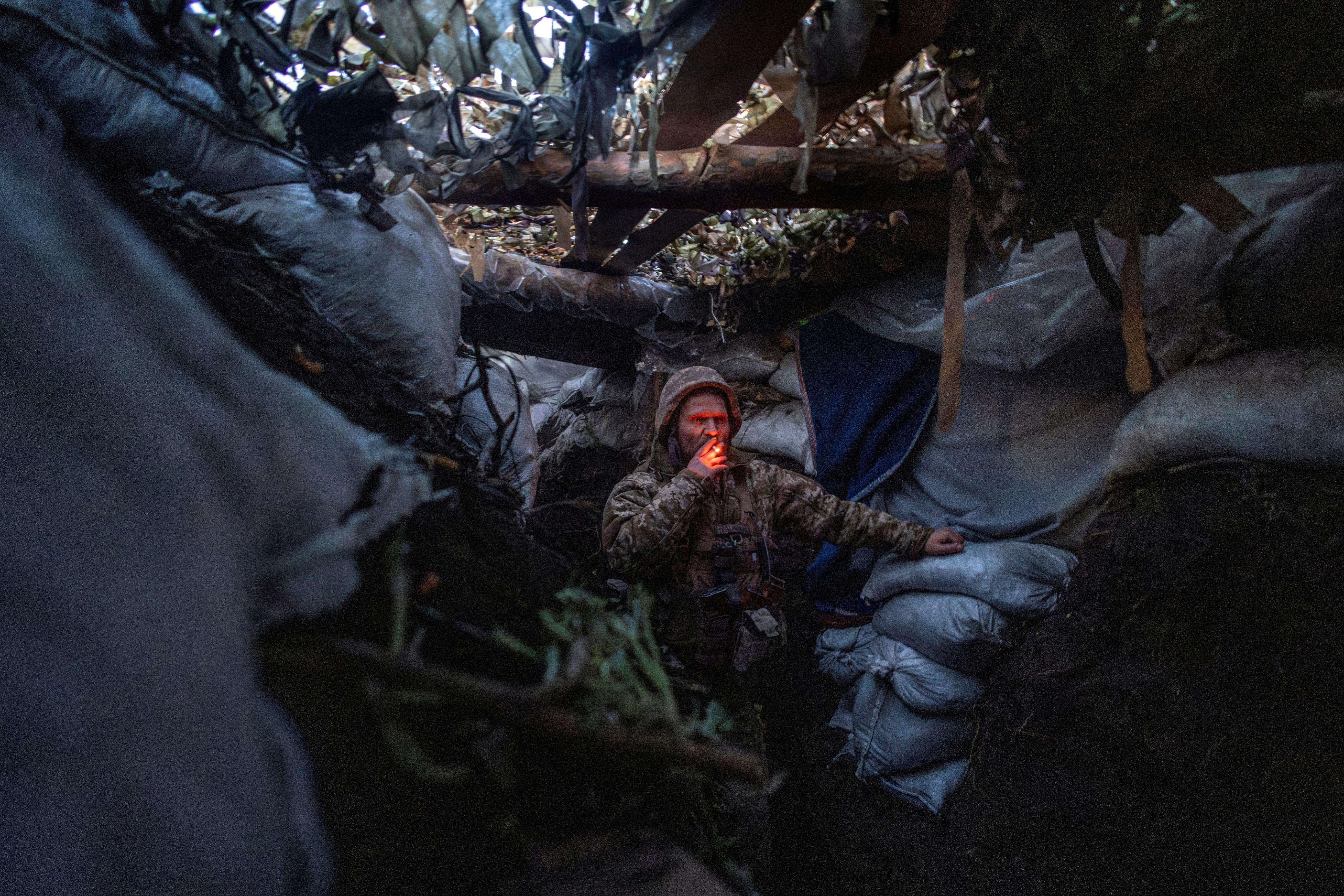 Infantry soldier Viktor of Ukraine’s 58th Motorized Brigade smokes while standing in a frontline trench on May 13, 2024. (Photo by Thomas Peter/Reuters)