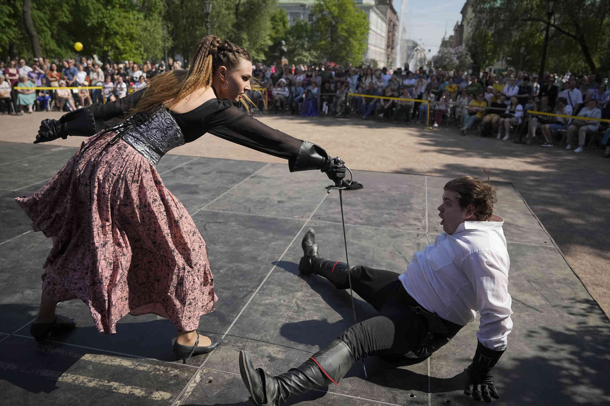 Participants of a fencing show fight during celebrations of the 321st anniversary of St. Petersburg, in St. Petersburg, Russia, Sunday, May 26, 2024. (Photo by Dmitri Lovetsky/AP Photo)