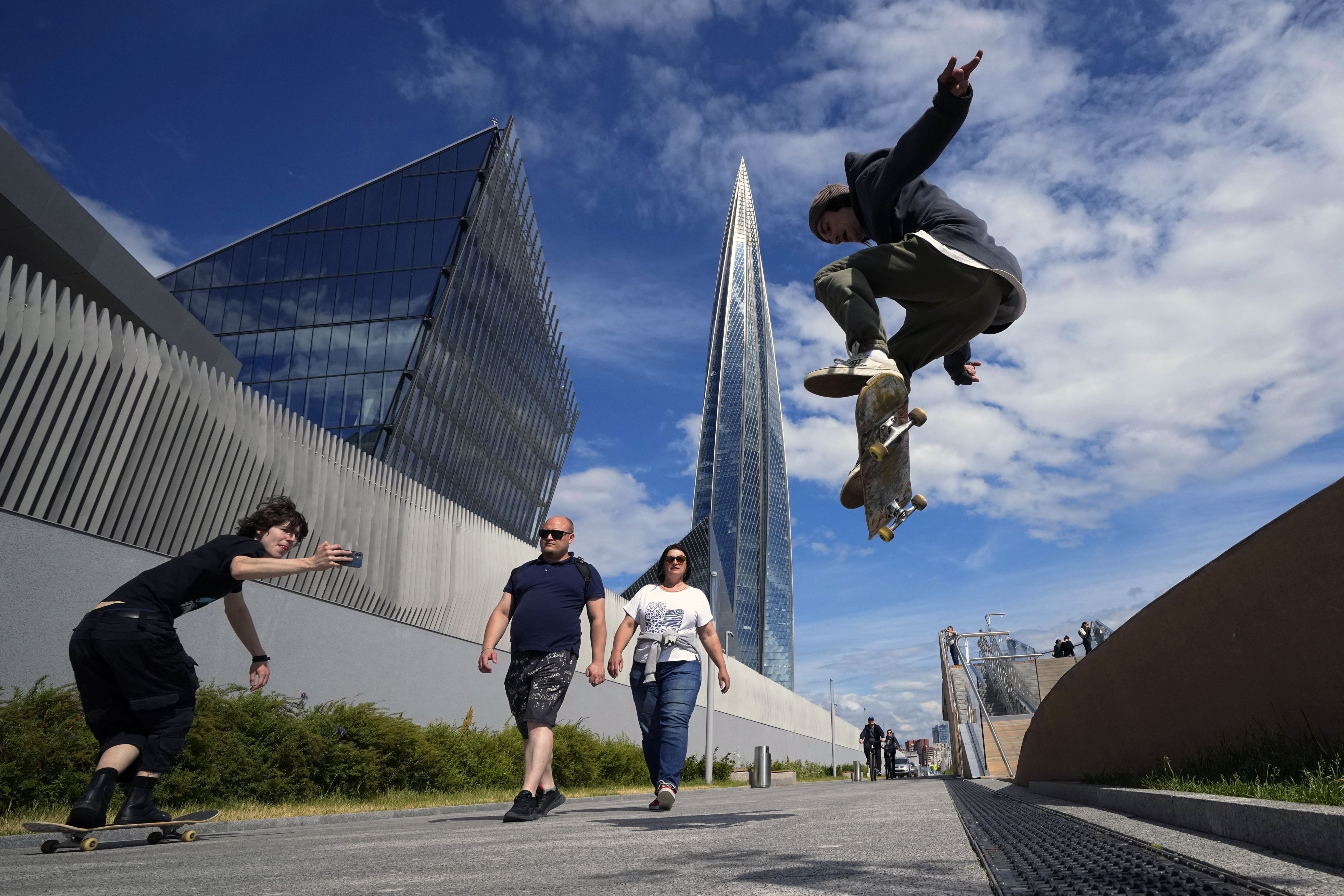 A boy jumps with a skateboard near the Lakhta Center skyscraper, the headquarters of Russian gas monopoly Gazprom in St. Petersburg, Russia, Wednesday, June 12, 2024. (Photo by Dmitri Lovetsky/AP Photo)