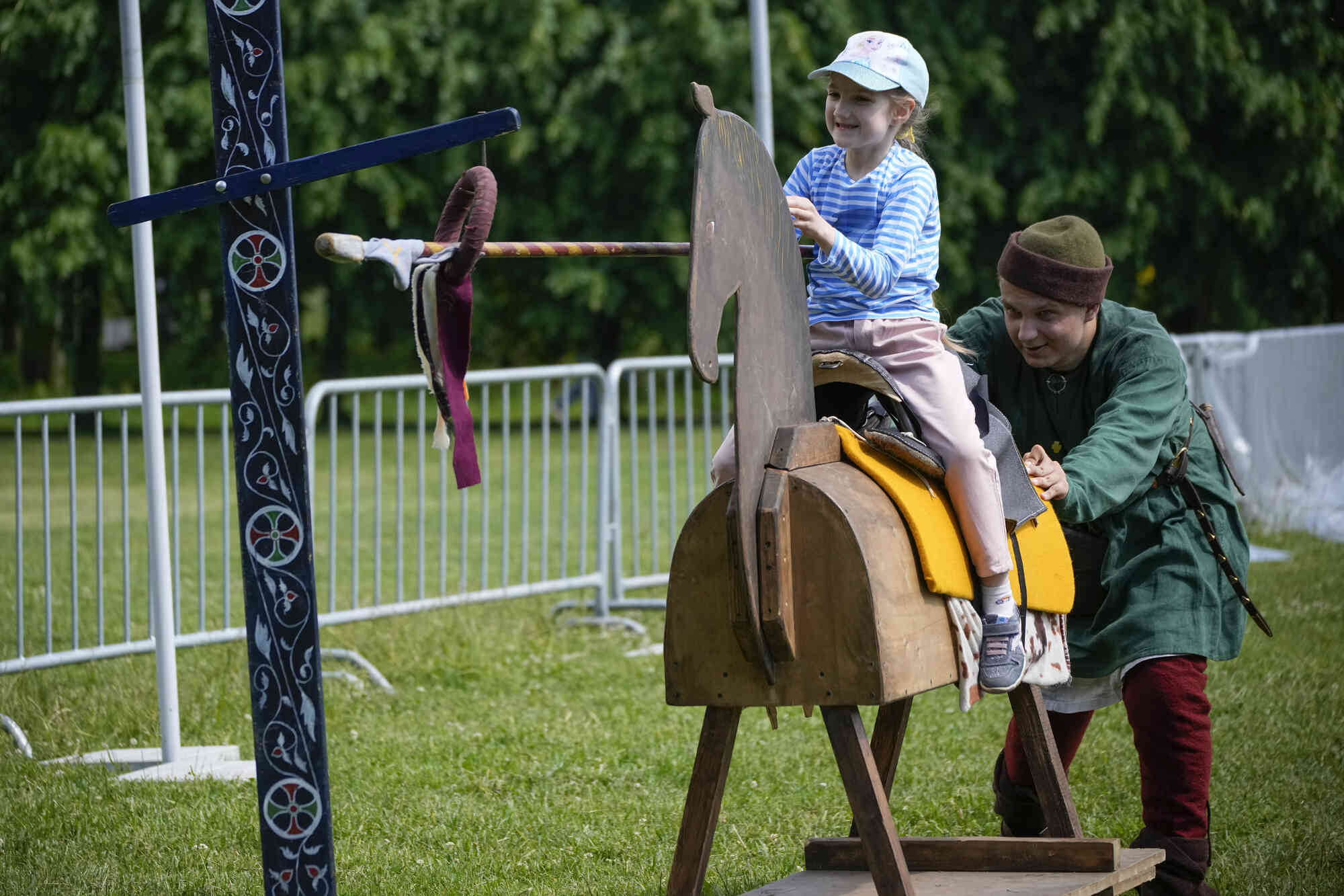 A member of a historic club pushes a wooden horse with a child depicting a horse fight during a festival dedicated to the Day of Russia in St. Petersburg, Russia, Wednesday, June 12, 2024. The Day of Russia is celebrated annually on June 12. (Photo by Dmitri Lovetsky/AP Photo)