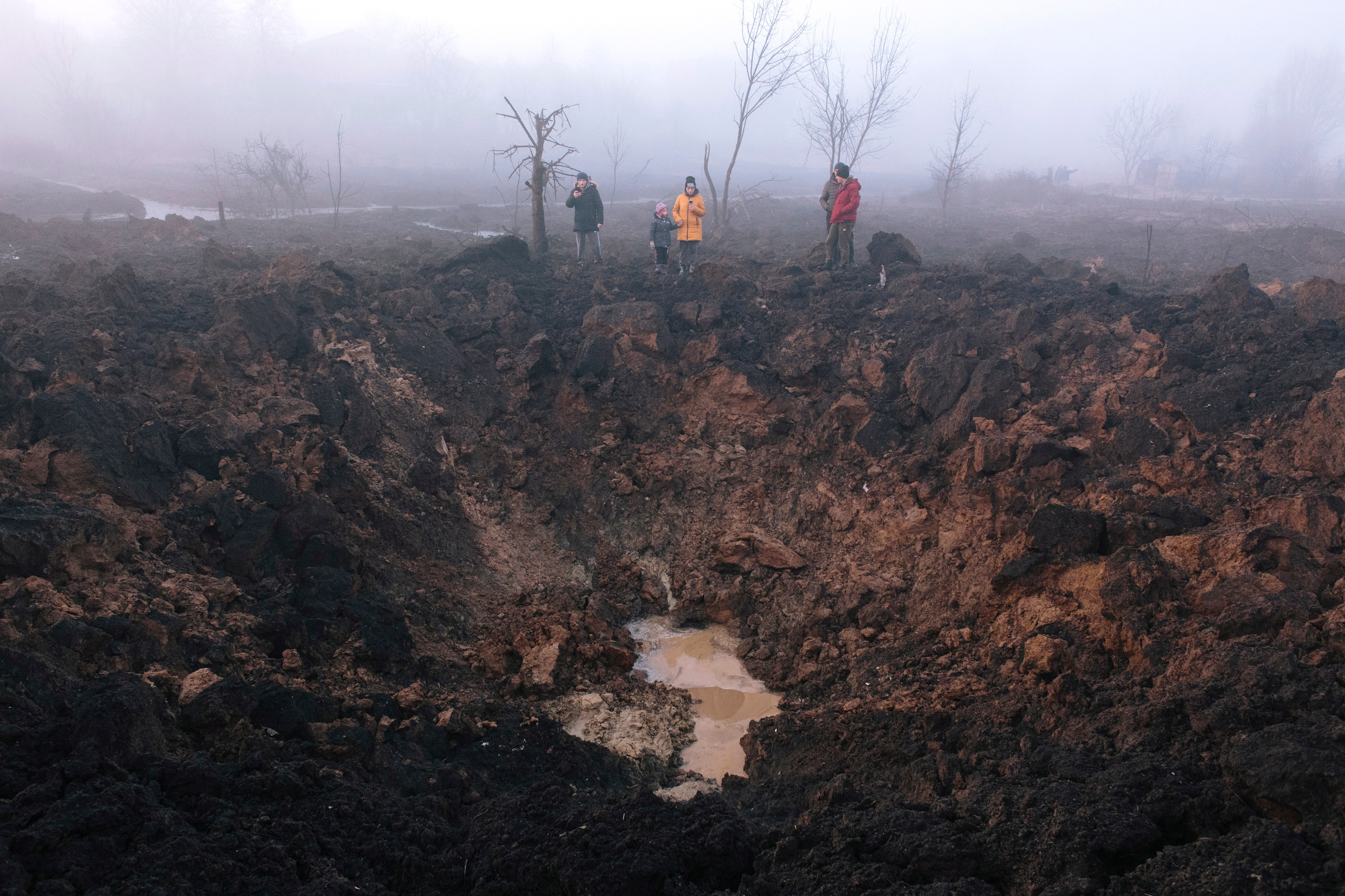 Locals gather around a shelling crater after a rocket hit the Pisochyn neighborhood outside Kharkiv, Ukraine, 09 March 2023. Ukrainian authorities said on 09 March that Russia fired 81 missiles across the country targeting critical infrastructure and residential buildings. The country's Defense Ministry confirmed that 34 cruise missiles were shot down. According to Ukraine's nuclear operator Energoatom, the Zaporizhzhia nuclear power plant (NPP) lost power as a result of the missile attacks, and was running on diesel generators. (Photo by Pavlo Pakhomenko/EPA/EFE)