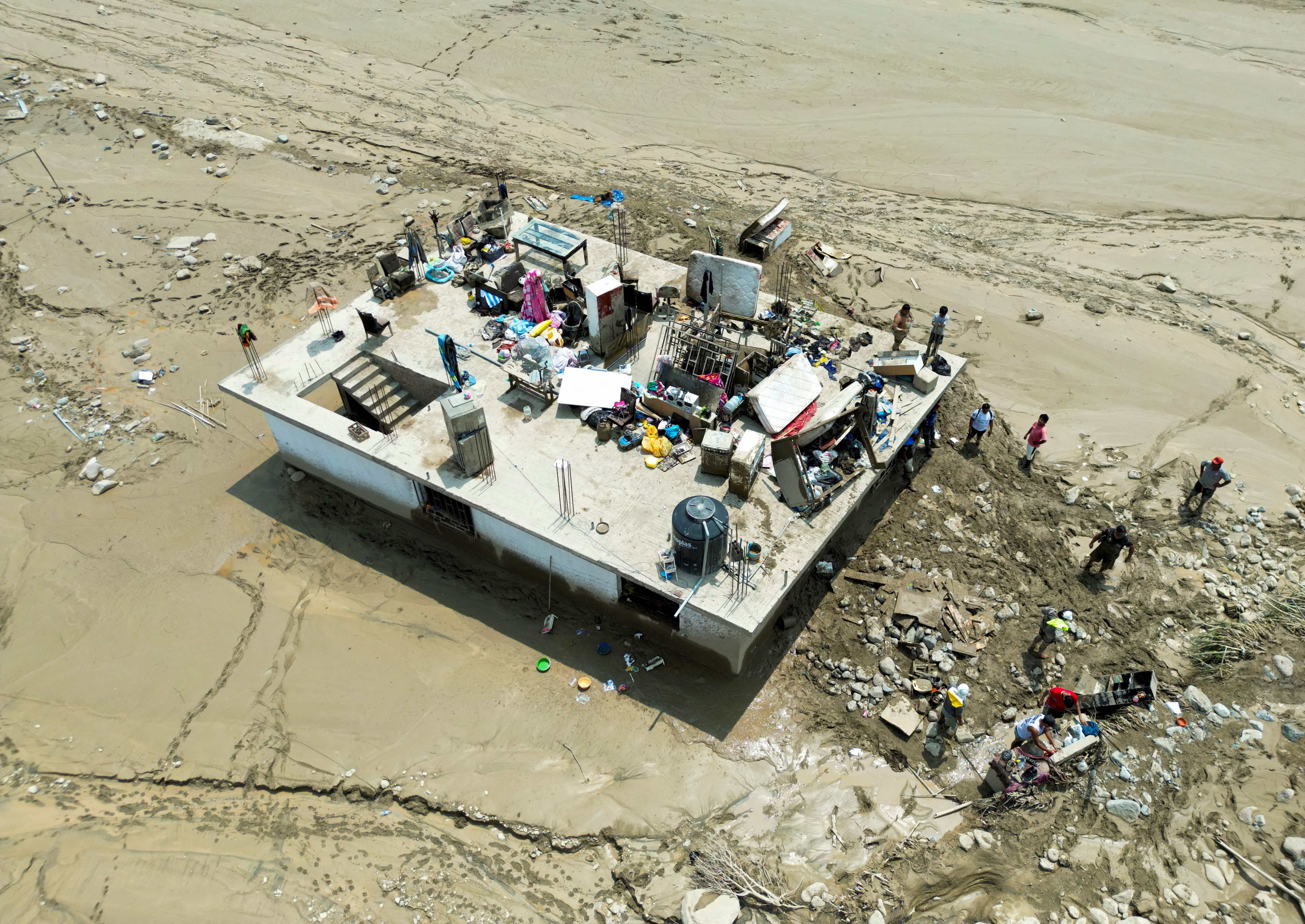 An aerial view of people who are guarding their belongings on top of a building is pictured in the aftermath of a landslide triggered by Cyclone Yaku, in Pachamac, Peru on March 16, 2023. (Photo by Sebastian Castaneda/Reuters)