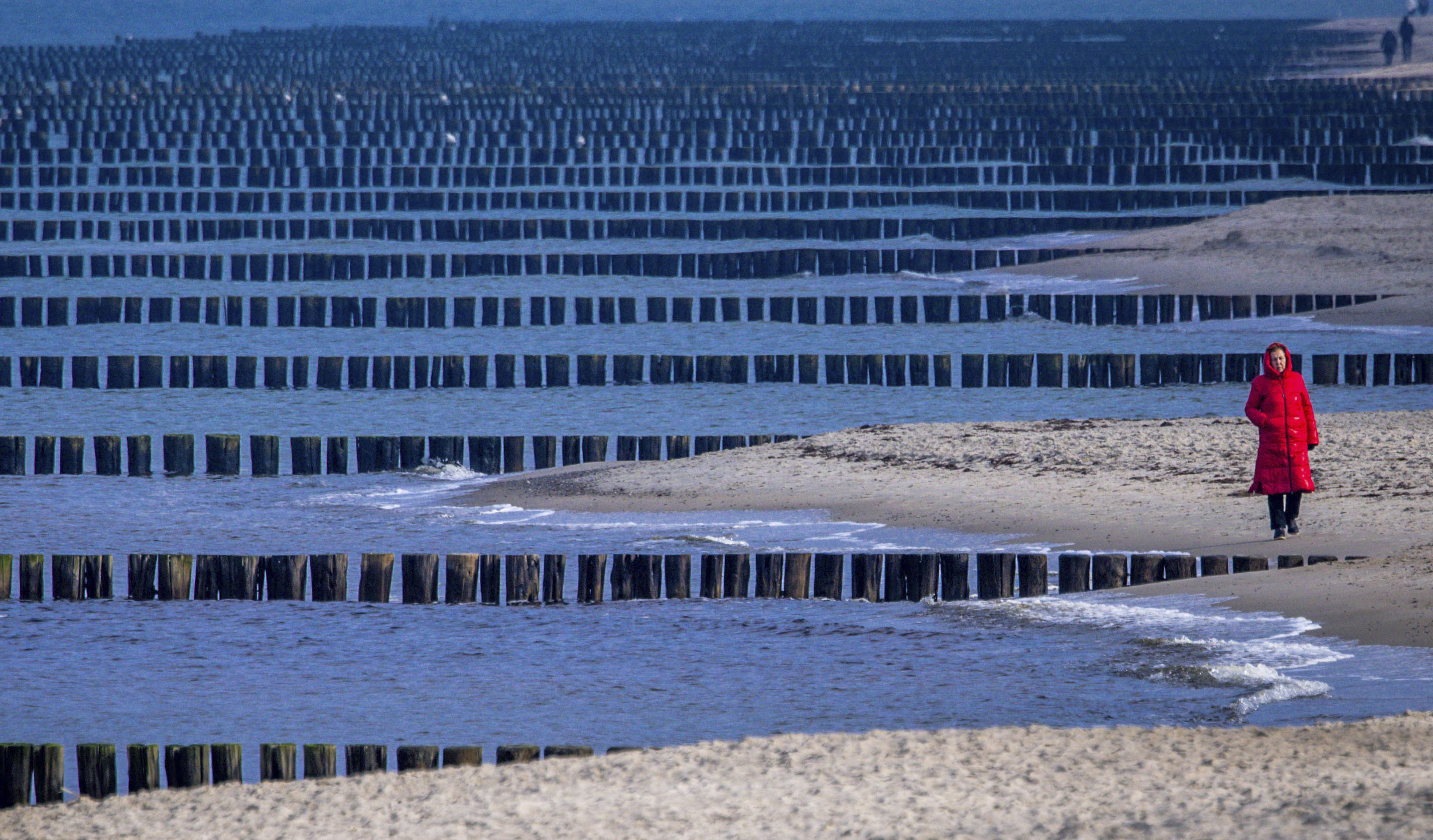 A woman walks on the Baltic Sea beach with its numerous rows of groynes, in Graal-Müritz, Germany, Wednesday, February 28, 2024. (Photo by Jens Büttner/dpa via AP Photo)