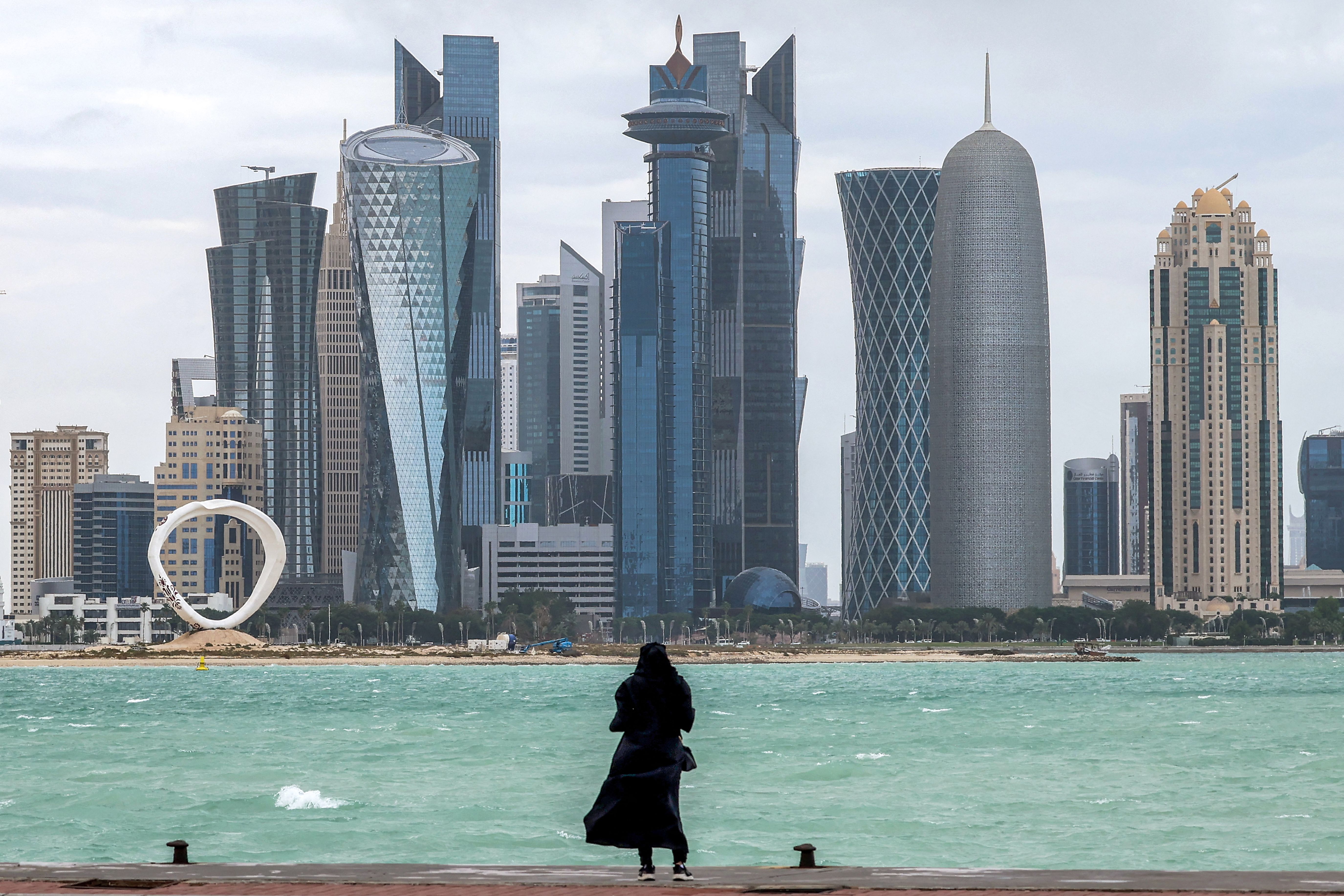 A woman stands by the waterfront at the Doha corniche facing the high-rise buildings in the West Bay district on April 16, 2024. (Photo by Karim Jaafar/AFP Photo)