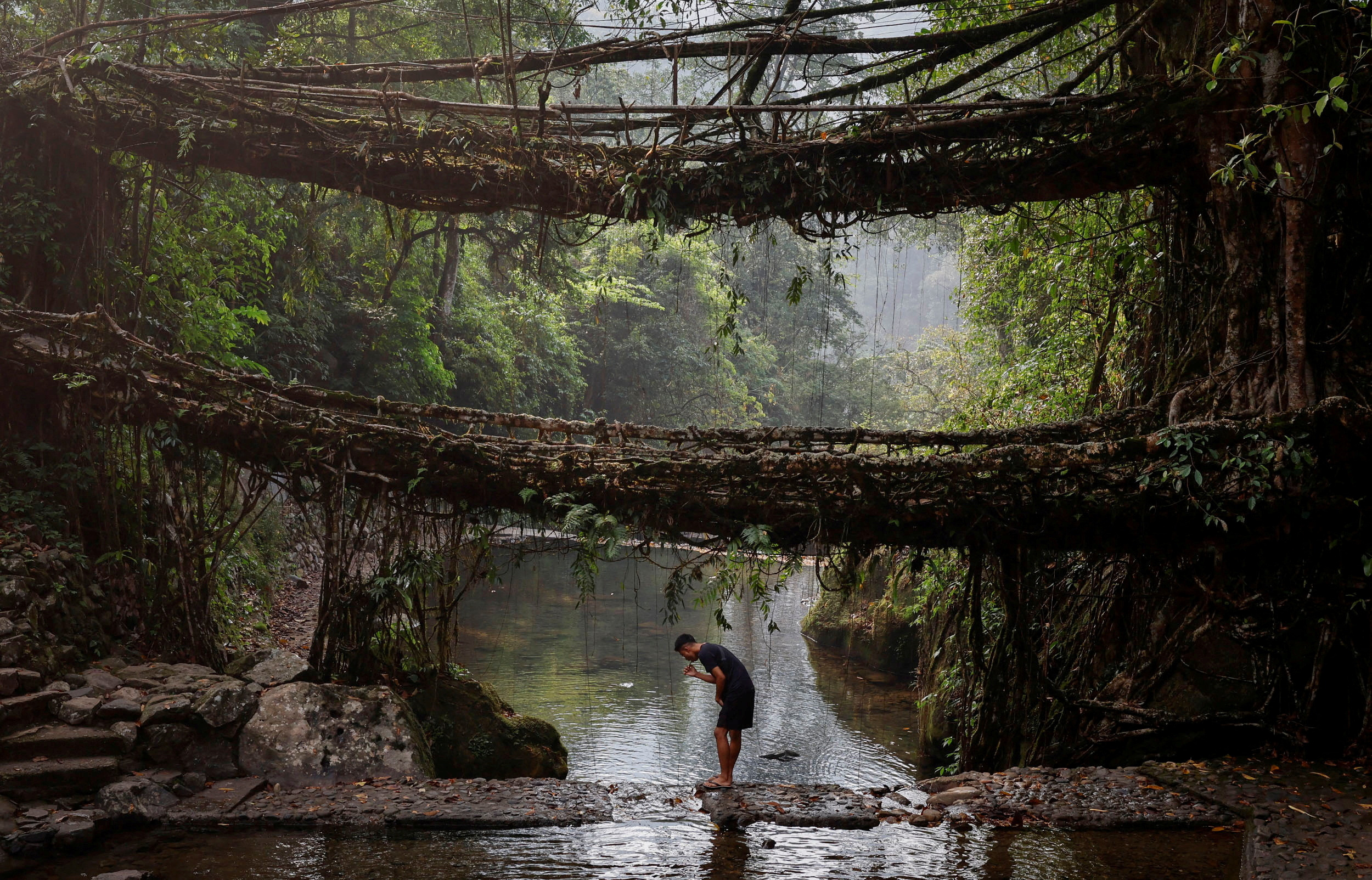 A security personnel, deployed on election duty, brushes his teeth under a double-decker root bridge after reaching Nongriat village, a remote polling station, ahead of the first phase of the election, in Shillong in the northeastern state of Meghalaya, India, on April 18, 2024. (Photo by Adnan Abidi/Reuters)