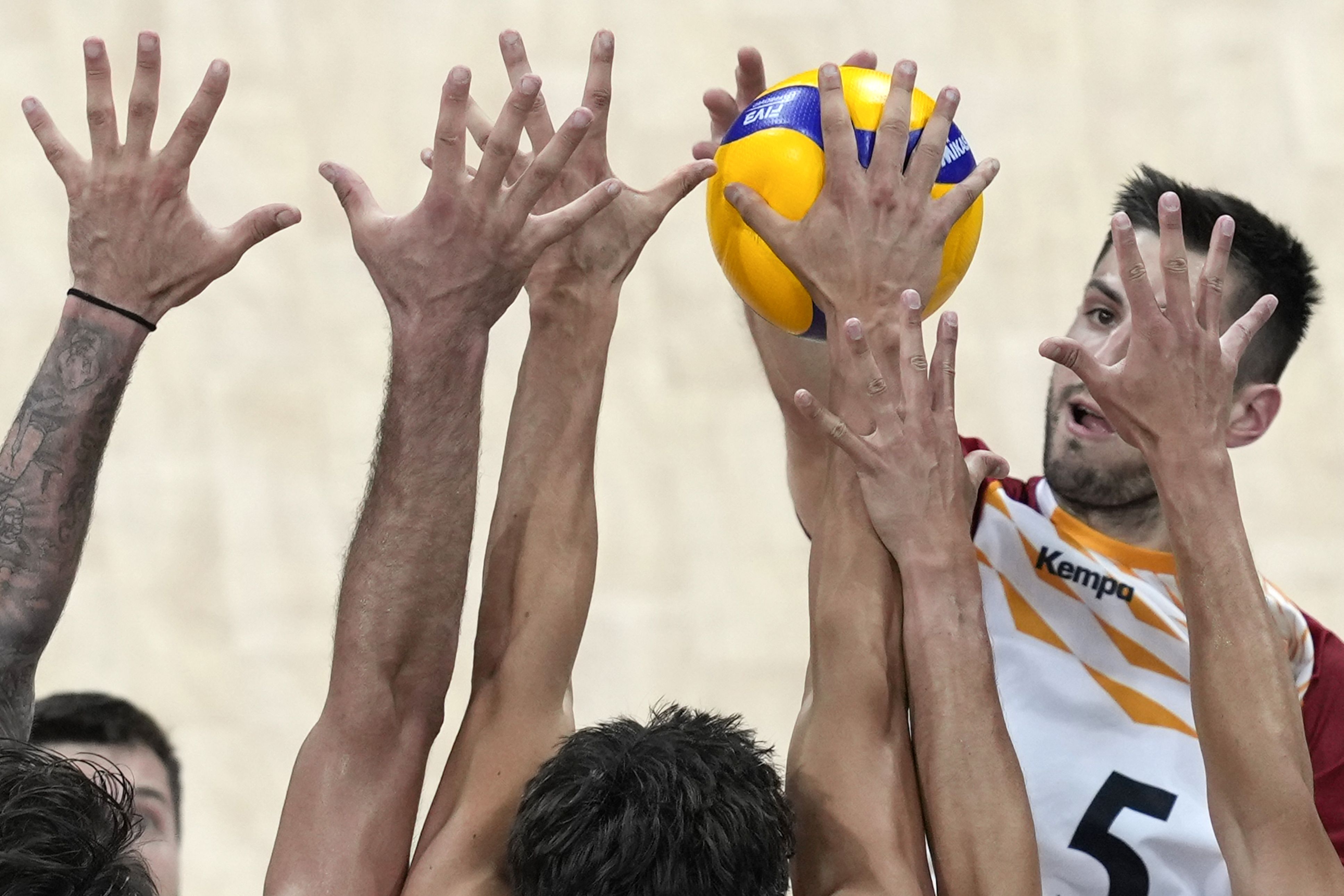 Moritz Reichert, of Germany, is blocked by players from USA during their Volleyball Men's Nations League match at the Mall of Asia Arena in Manila, Philippines on Saturday, June 22, 2024. (Photo by Aaron Favila/AP Photo)