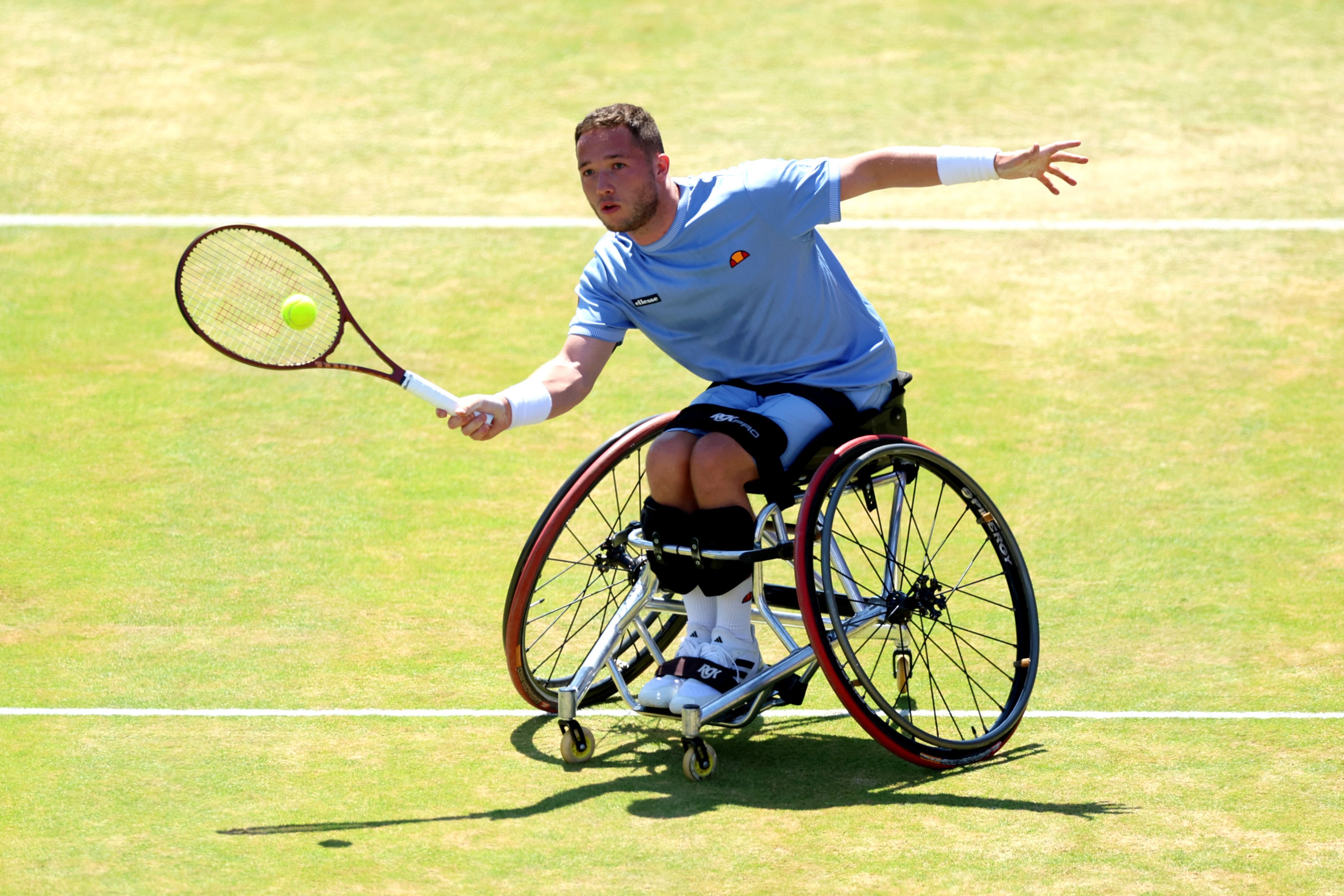 Alfie Hewett of Great Britain plays a forehand against Gordon Reid of Great Britain during the Wheelchair Singles match on Day Seven of the cinch Championship at The Queen's Club on June 23, 2024 in London, England. (Photo by Luke Walker/Getty Images for LTA)