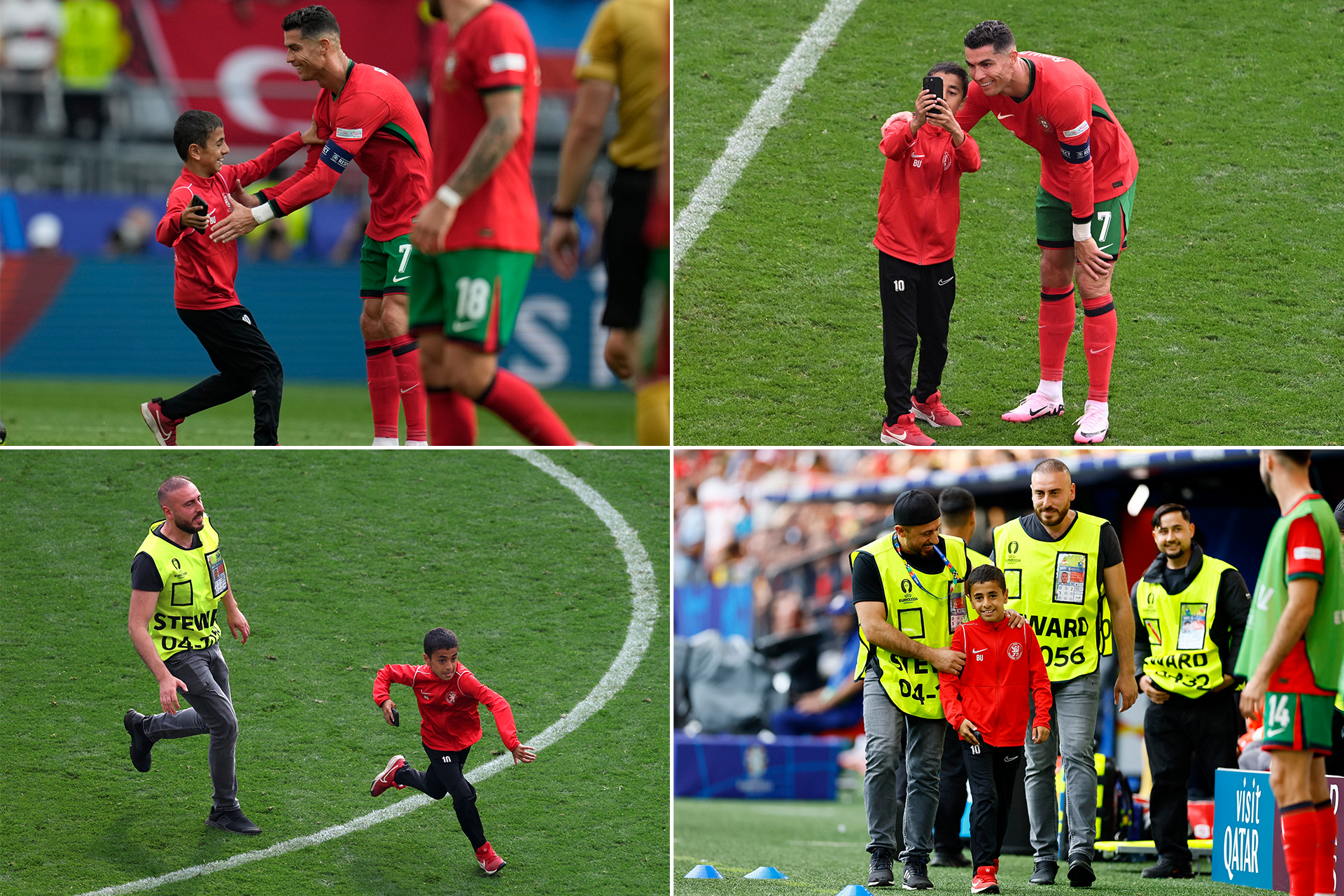 A little boy who invades the pitch takes a selfie with Cristiano Ronaldo of Portugal during the UEFA EURO 2024 group stage match between Turkiye and Portugal at Football Stadium Dortmund on June 22, 2024 in Dortmund, Germany. (Photo by Eurasia Sport Images/Getty Images)