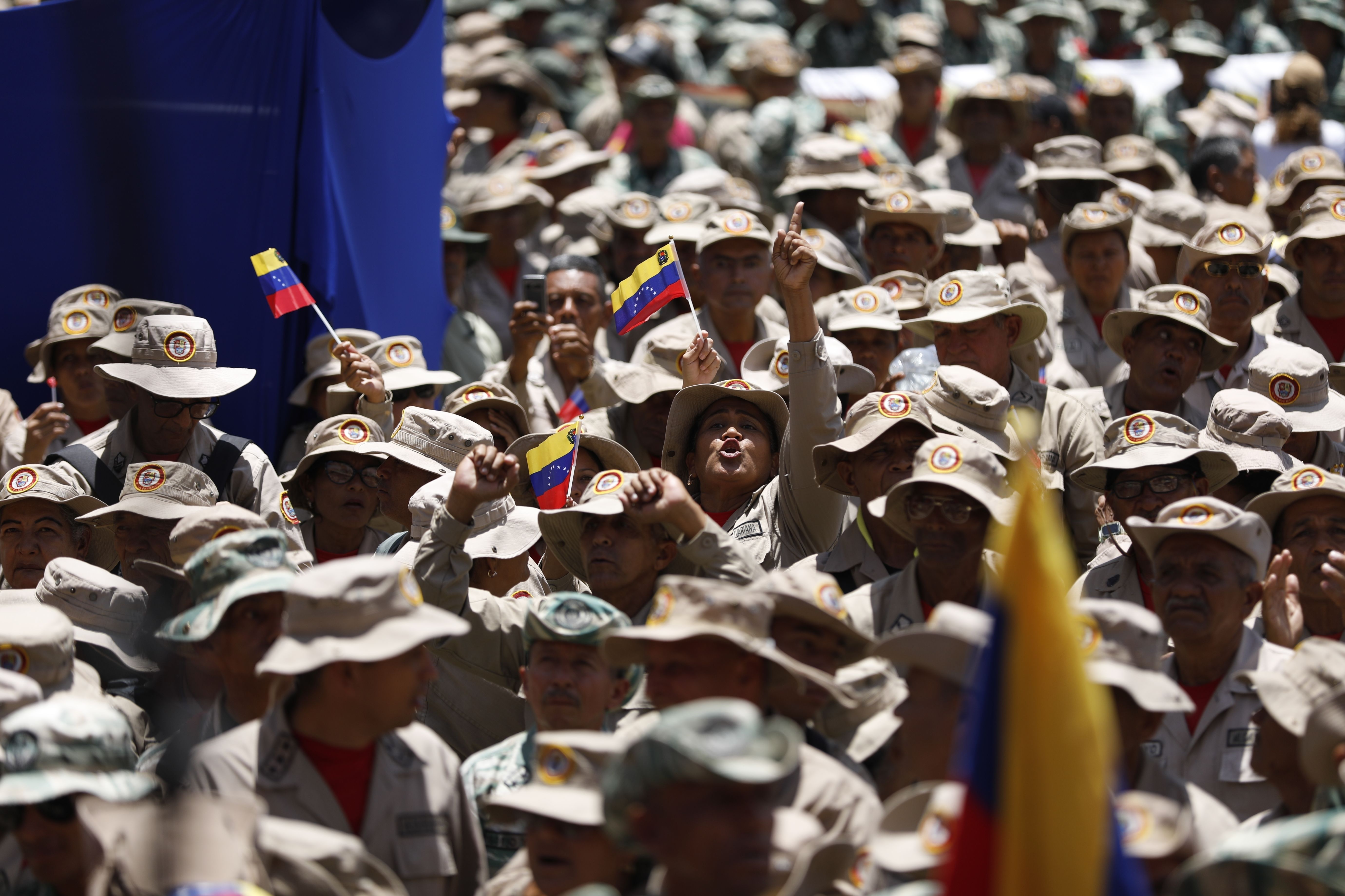 Members of the Bolivarian Militia gather for a rally marking the 22nd anniversary of the late President Hugo Chavez's return to power after a failed coup attempt, in Caracas, Venezuela, April 13, 2024. (Photo by Pedro Ramsee/AP Photo)