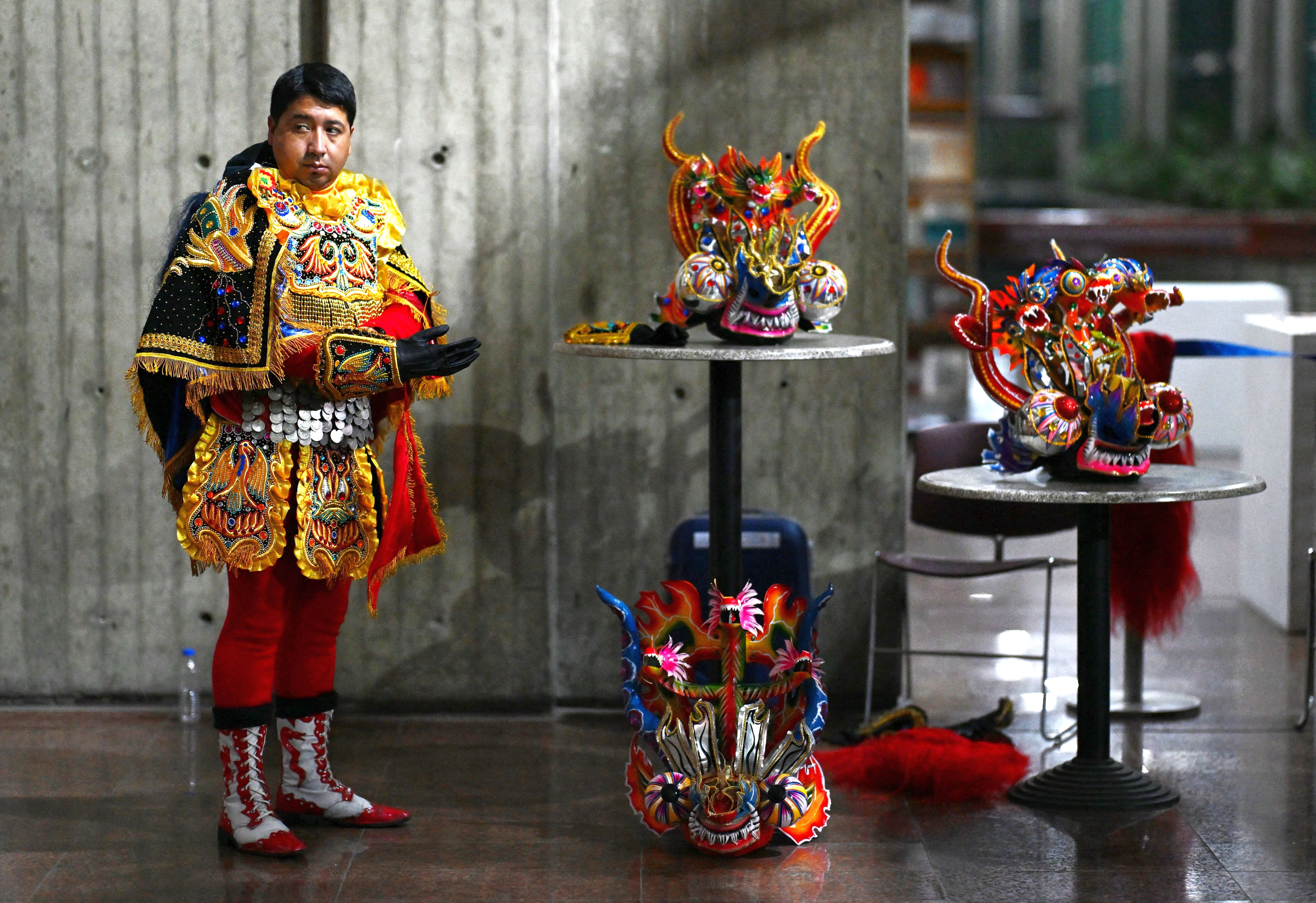 A dancer from Bolivia's La Diablada de Oruro prepares before performing during the Viva Venezuela World Festival in Caracas on May 13, 2024. (Photo by Juan Barreto/AFP Photo)