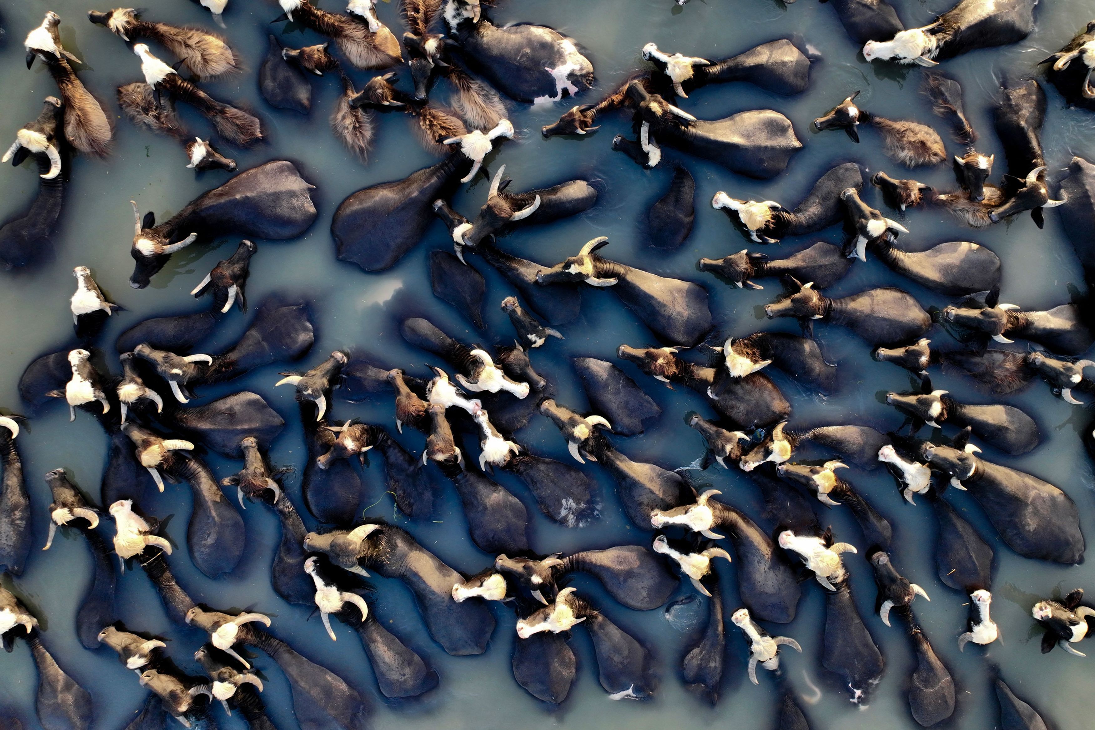 This aerial picture shows buffalos cooling off in a branch of the Euphrates river near the central Iraqi city of Hilla on May 31, 2024. (Photo by Karar Jabbar / AFP)
