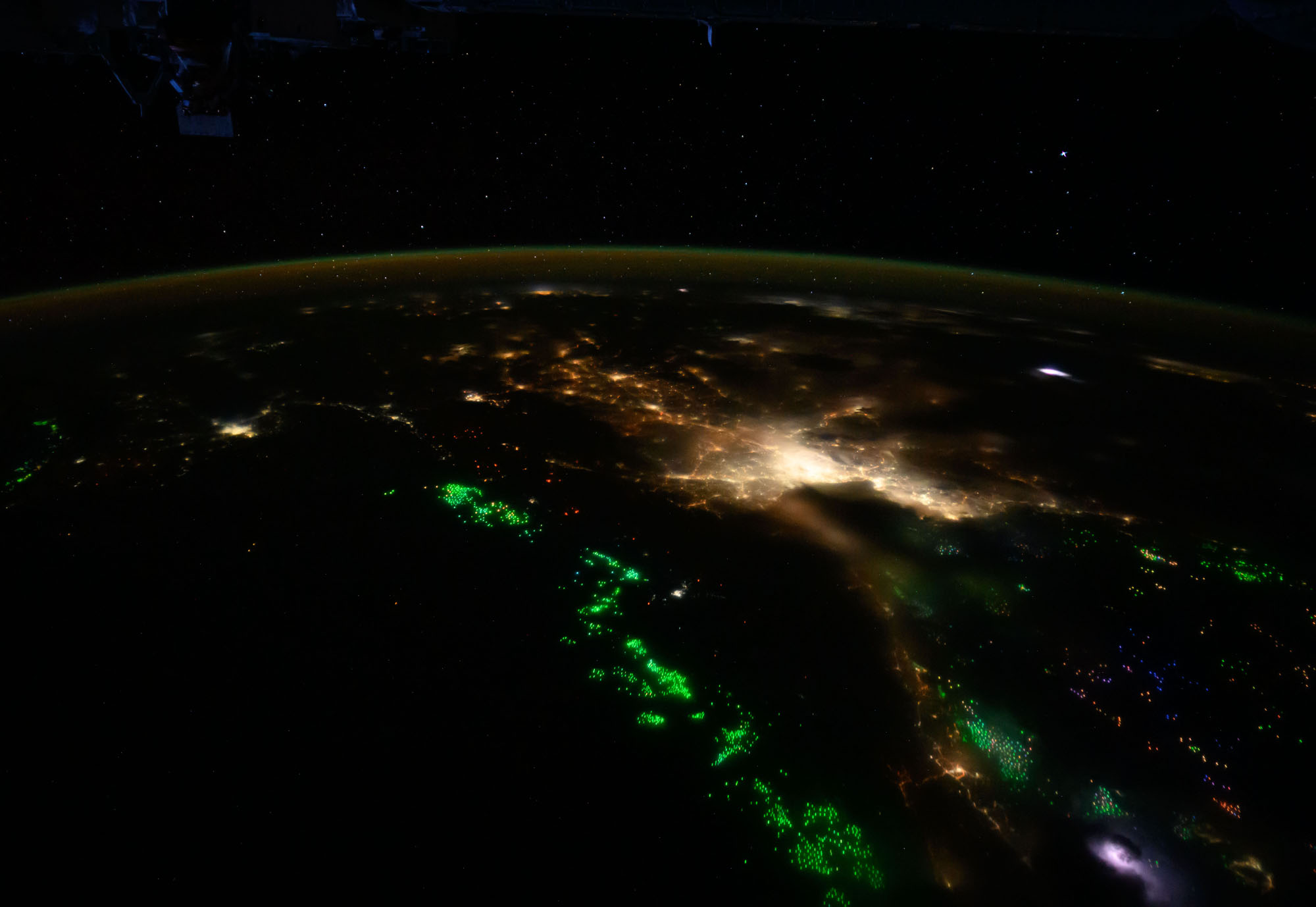 The city lights of Bangkok, Thailand, and its suburbs contrast with the green lights of fishing boats on the Gulf of Thailand and the Andaman Sea, seen on May 6, 2024. (Photo by NASA)
