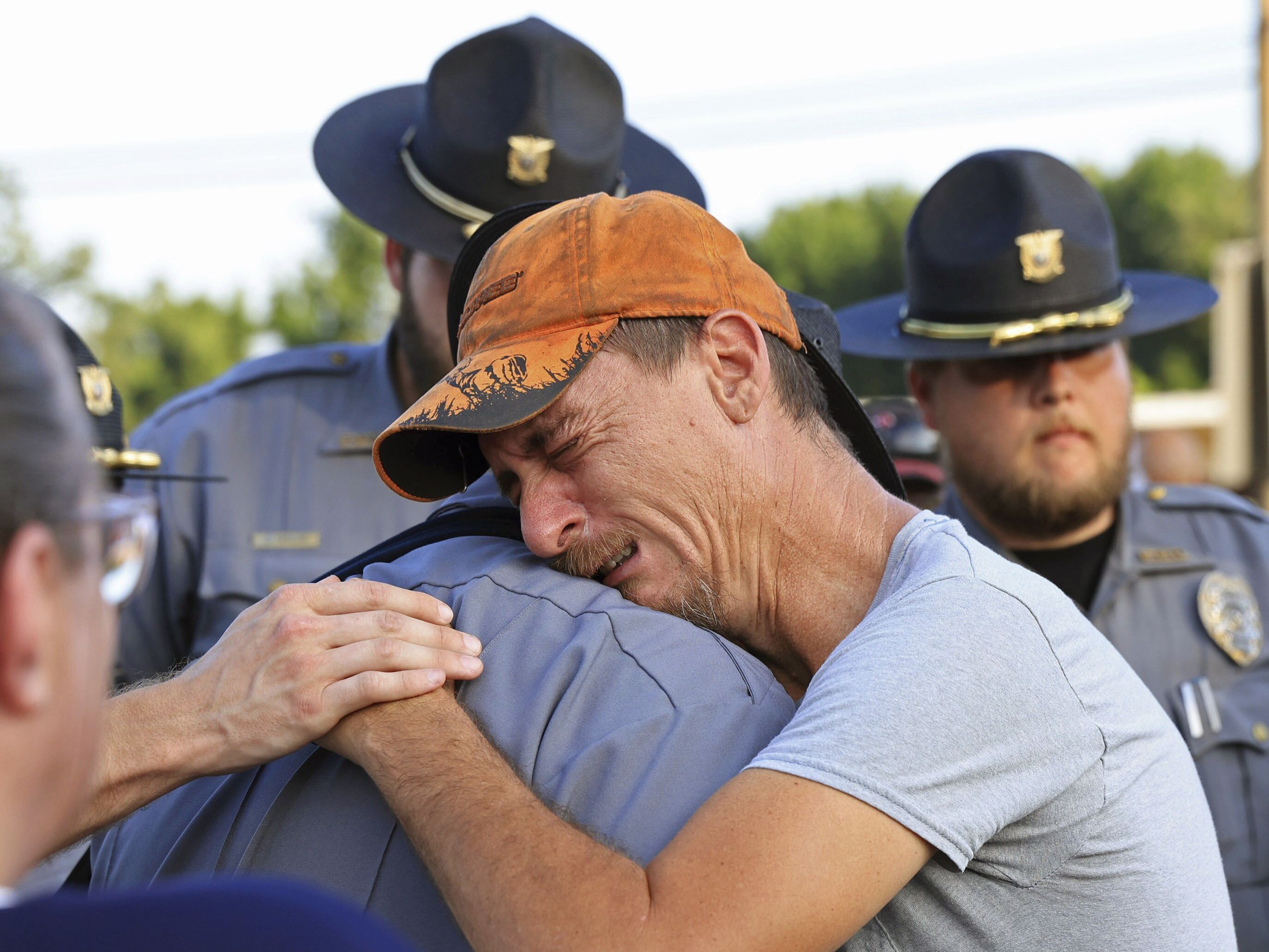 Bo Lanthrop, right, embraces a member of the Fordyce Police Department during a candlelight vigil in the parking lot of the Mad Butcher grocery store in honor of the victims of Friday's mass shooting, in Fordyce, Ark., Sunday, June 23, 2024. (Photo by Colin Murphey/Arkansas Democrat-Gazette via AP Photo)