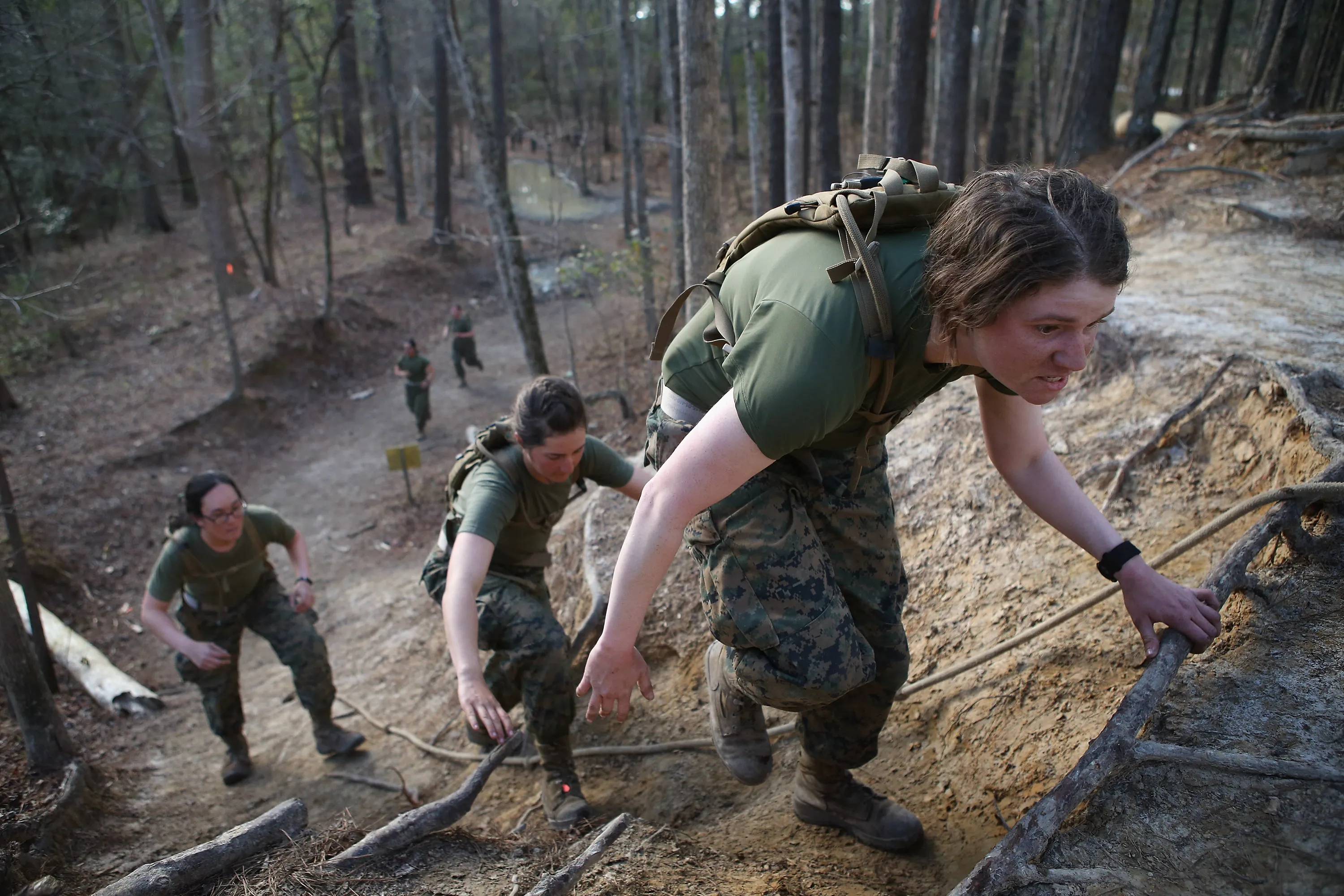 CAMP LEJEUNE, NC - FEBRUARY 20: Female Marines climb a hill while running the Endurance Course during Marine Combat Training (MCT) on February 20, 2013 at Camp Lejeune, North Carolina. Since 1988 all non-infantry enlisted male Marines have been required to complete 29 days of basic combat skills training at MCT after graduating from boot camp. MCT has been required for all enlisted female Marines since 1997. About six percent of enlisted Marines are female. (Photo by Scott Olson/Getty Images)