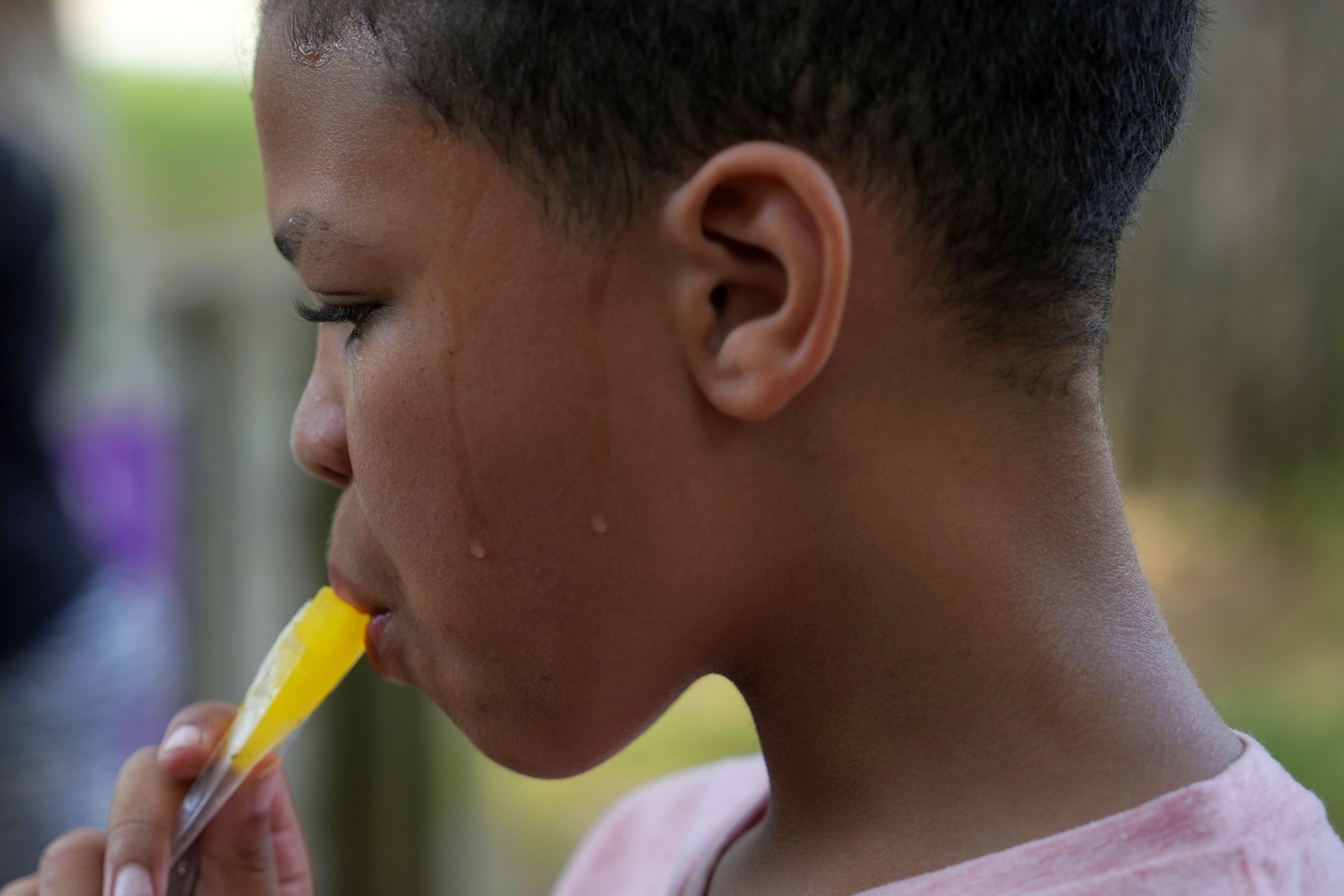 Zariah Fields eats a popsicle, Thursday, June 20, 2024, at YMCA Camp Kern in Oregonia, Ohio. As the first heat wave of the season ripples across the U.S., summer camps are working to keep their children cool while still letting the kids enjoy being outside with nature. (Photo by Joshua A. Bickel/AP Photo)
