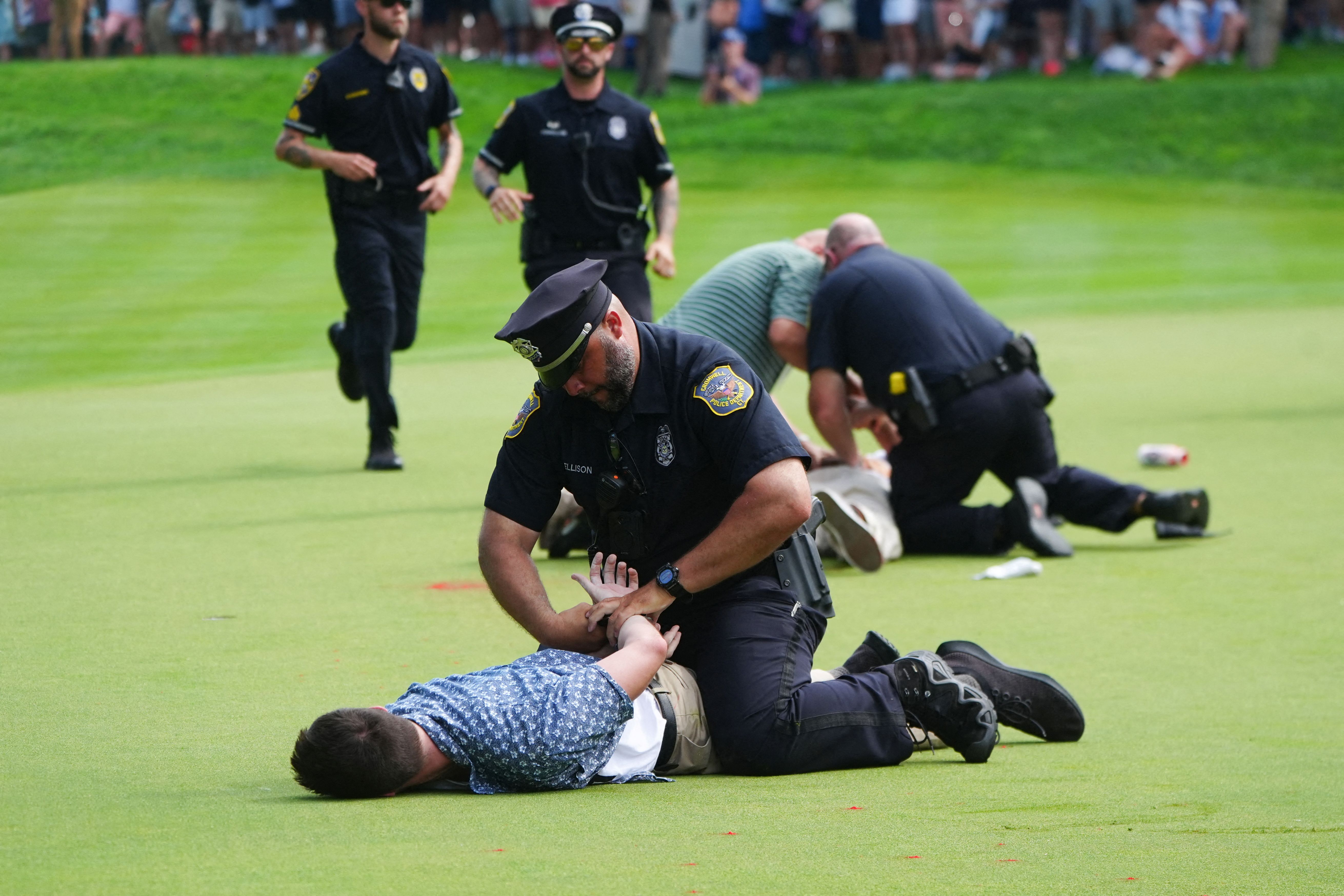 Police handcuff protesters on the eighteenth hole during the final round of the Travelers Championship golf tournament at TPC River Highlands in Cromwell, Connecticut on June 23, 2024. (Photo by /Reuters). (Photo by Gregory Fisher/USA TODAY Sports)