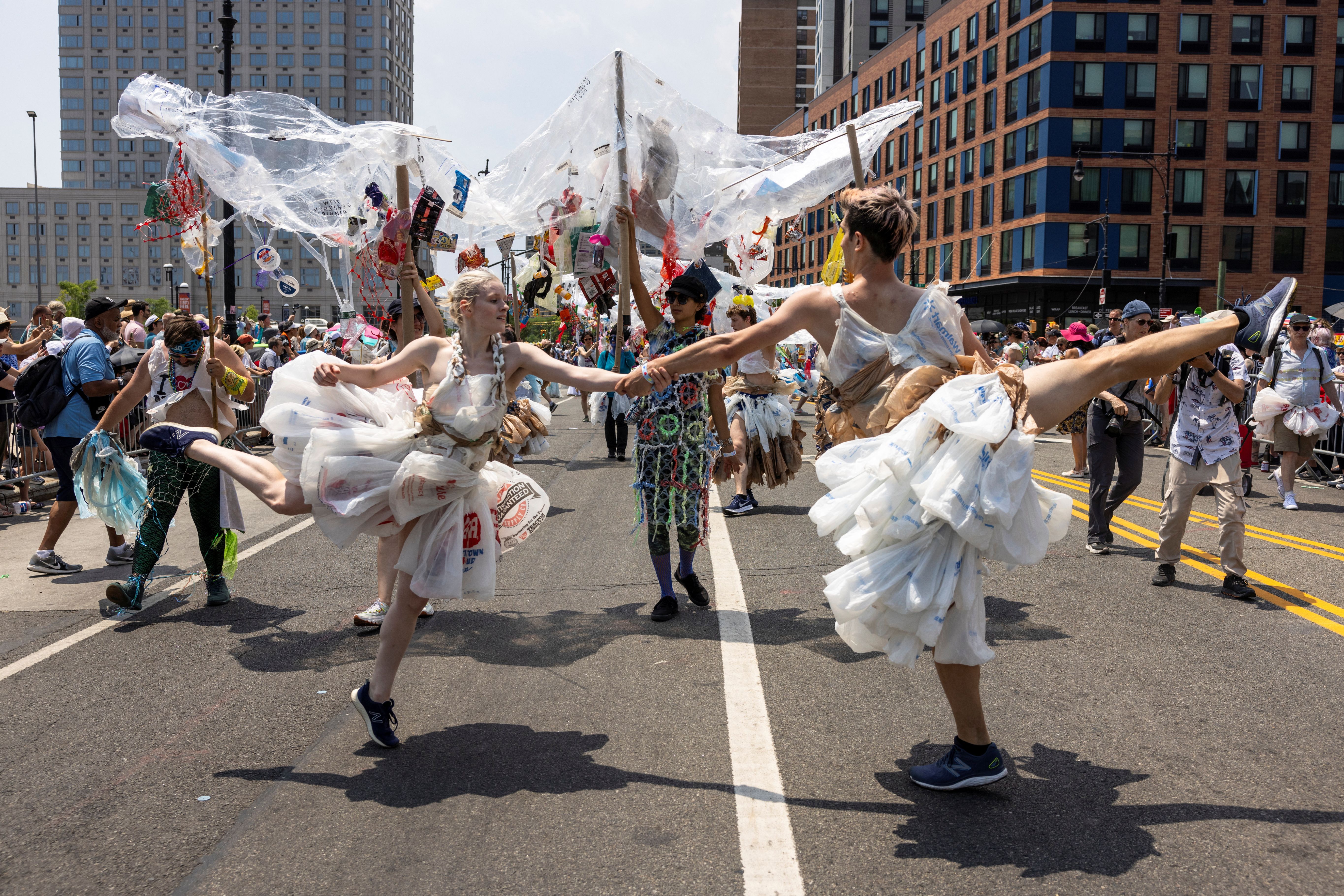 People raising awareness about plastic ocean pollution dance while participating in the Mermaid Parade during a heatwave in Coney Island, area of Brookly, New York City, U.S., June 22, 2024. (Photo by Caitlin Ochs/Reuters)