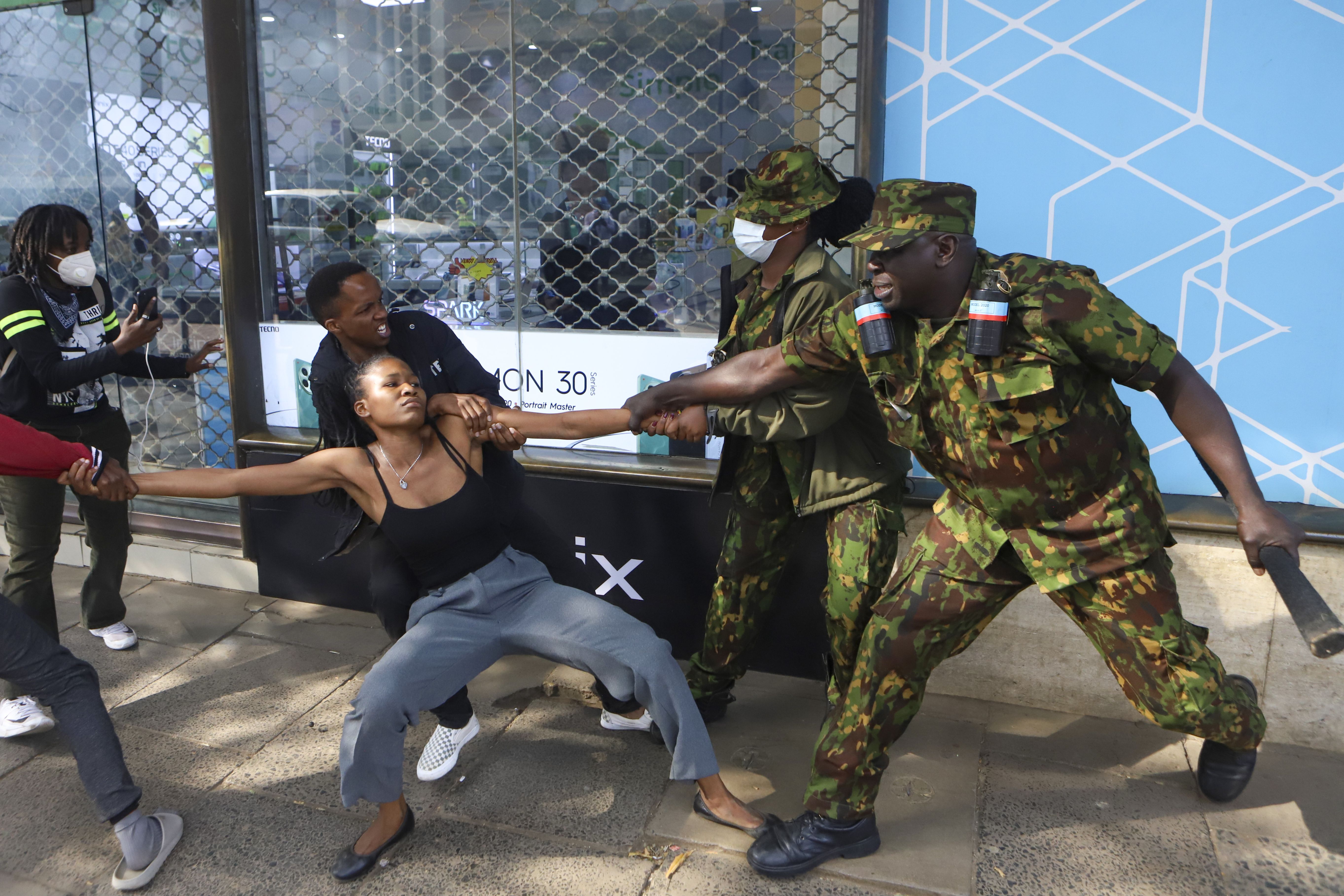 Police officers arrest a demonstrator protesting against proposed tax hikes in a finance bill that is due to be tabled in parliament in Nairobi, Kenya, Tuesday, June 18, 2024. Civil society groups say that despite the dozens of arrests, demonstrations and a planned sit-down outside the parliament buildings will continue. (Photo by Andrew Kasuku/AP Photo)