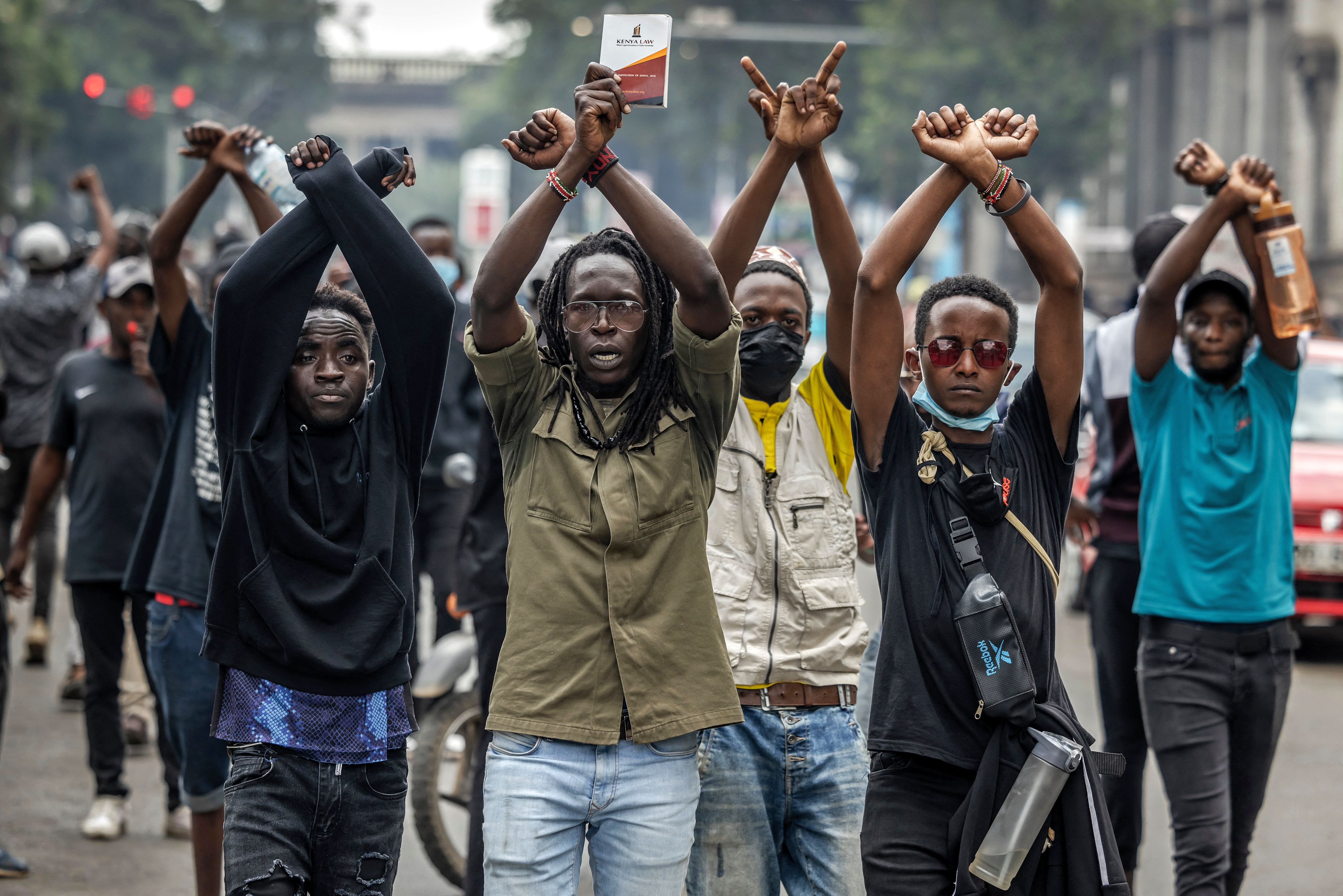 Protesters make signs with their arms in front of Kenya police officers during a demonstration against tax hikes as Members of the Parliament debate the Finance Bill 2024 in downtown Nairobi, on June 18, 2024. Kenyan police fired tear gas and arrested dozens of demonstrators on June 18, 2024 as hundreds of people gathered near the Parliament building to protest tax hikes. (Photo by Luis Tato/AFP Photo)