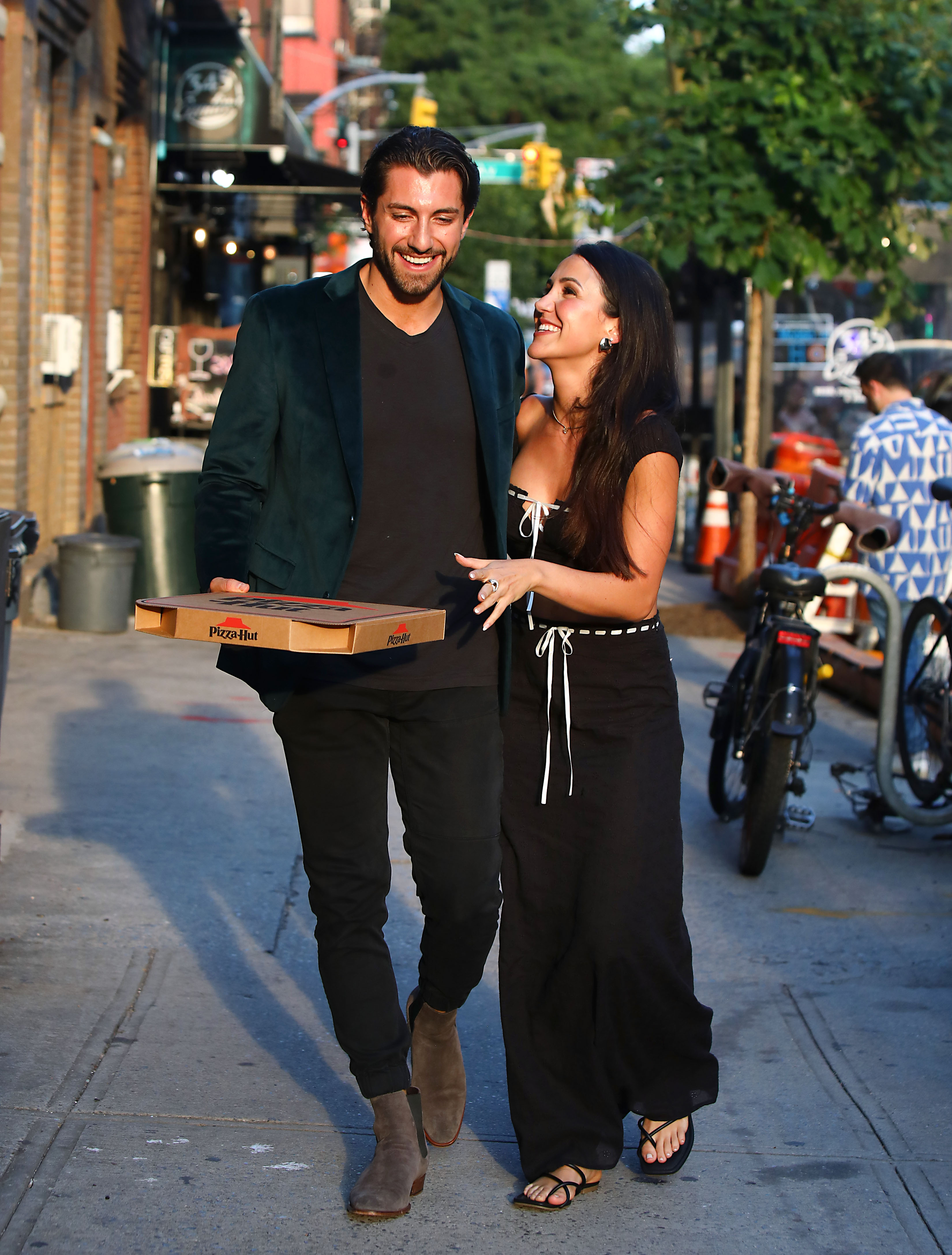 Banker Jason Tartick and TikTok star Kat Stickler taste Pizza Hut's new Chicago Tavern-Style pizza during the launch party at Mister Paradise on June 18, 2024 in New York City. (Photo by Sara Jaye/Getty Images for Pizza Hut)