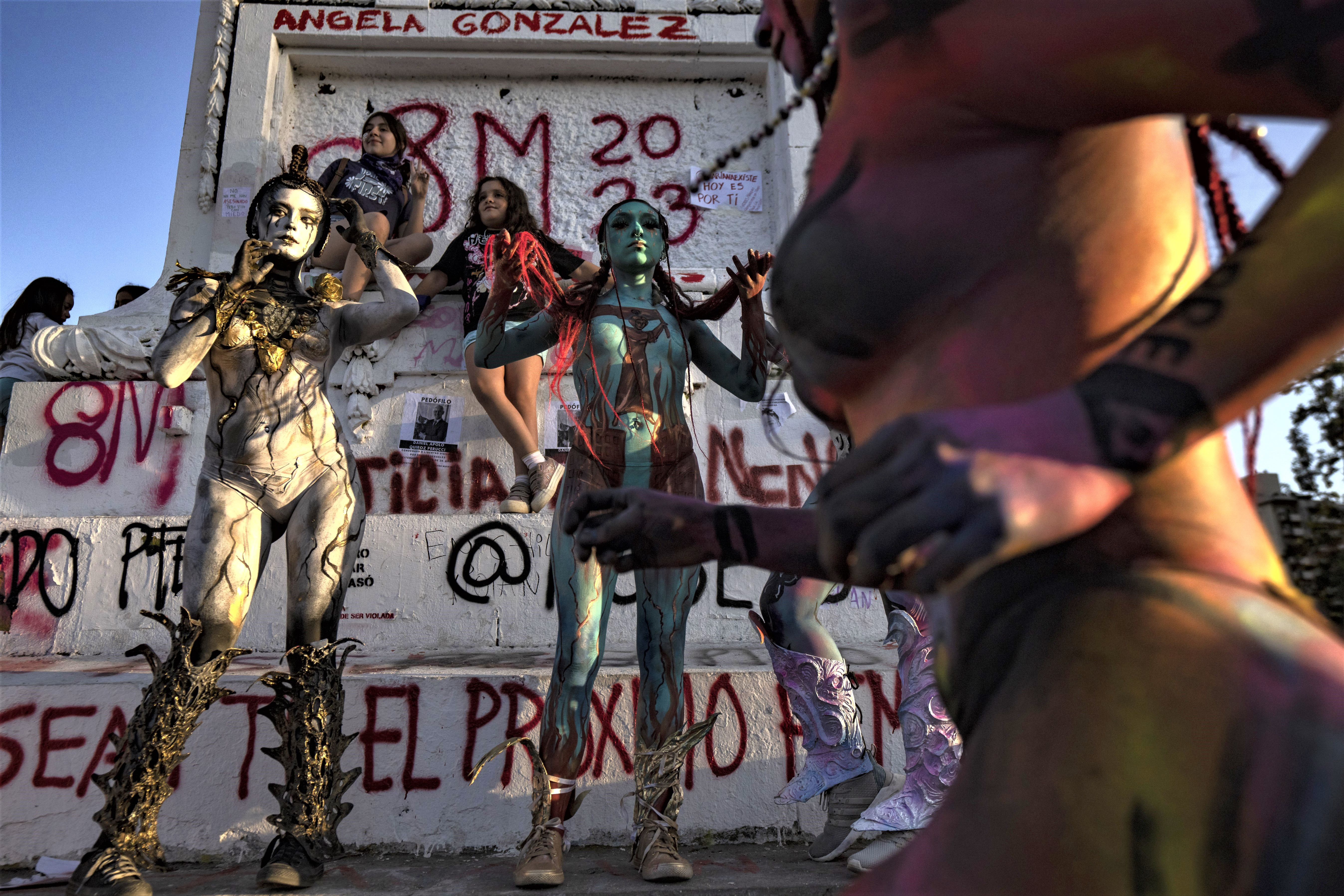 Women of the feminist group called "Nuestros Pilares" perform during a demonstration against gender-based violence on International Women's Day in Santiago, Chile, Wednesday, March 8, 2023. (Photo by Esteban Felix/AP Photo)