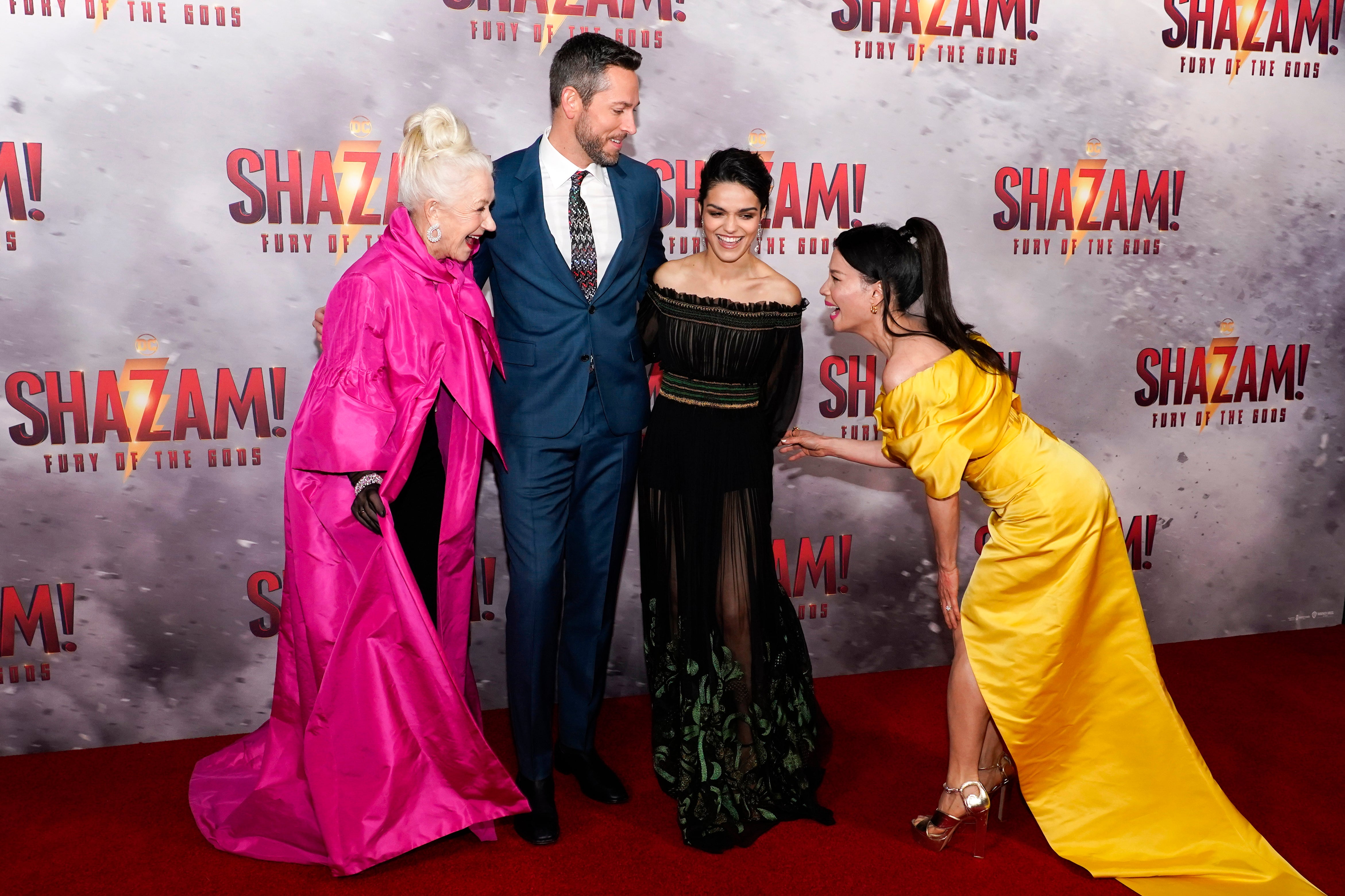 Actors Helen Mirren, Zachary Levi, Rachel Zegler and Lucy Liu pose for photographers upon arrival at the premiere of the film “Shazam! Fury of the Gods” in London, Tuesday, March 7, 2023.(Photo by Alberto Pezzali/Invision/AP Photo)