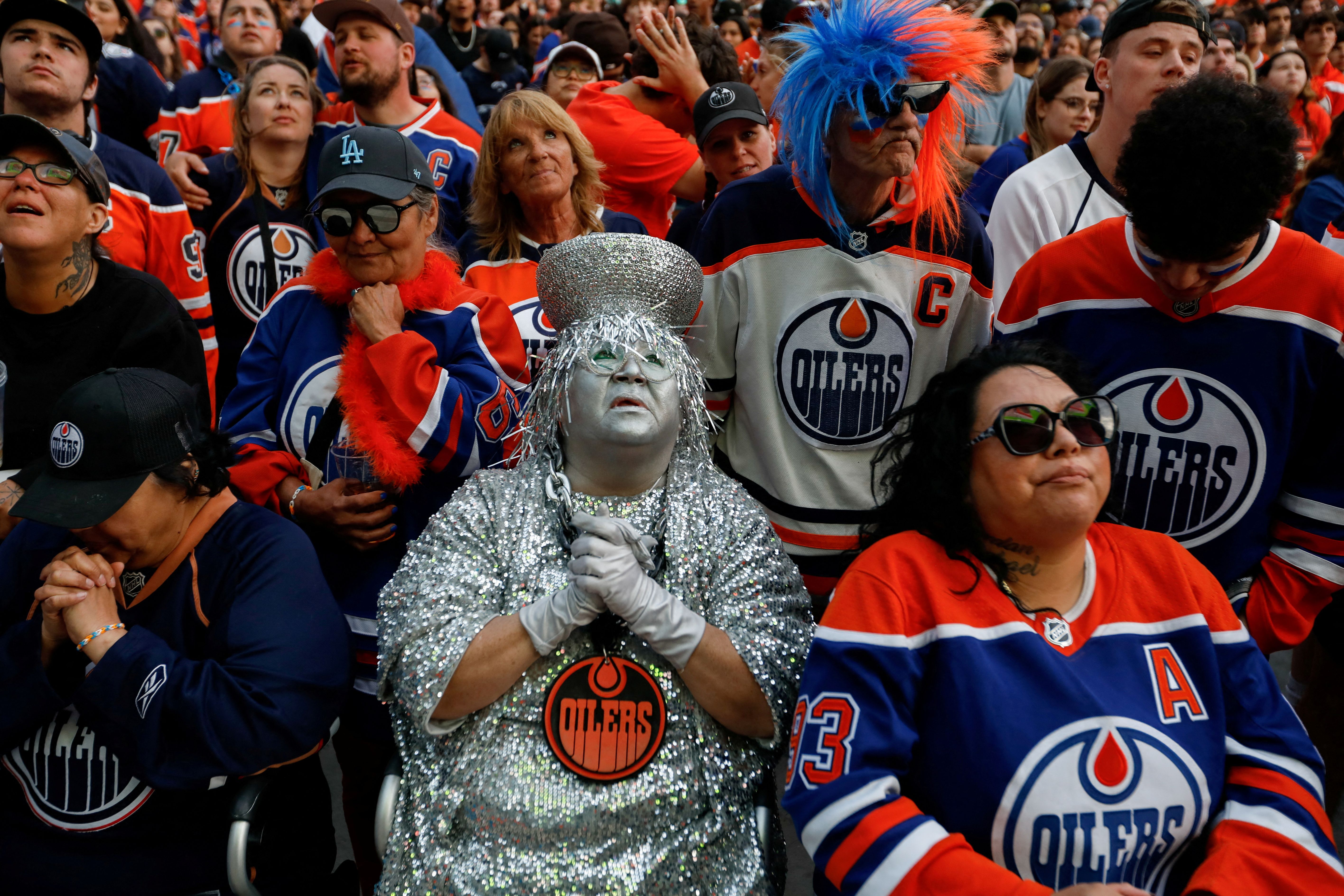 Fans react as they watch game seven of the 2024 Stanley Cup Final between the Edmonton Oilers and Florida Panthers in Edmonton, Alberta, Canada on June 24, 2024. (Photo by Amber Bracken/Reuters)