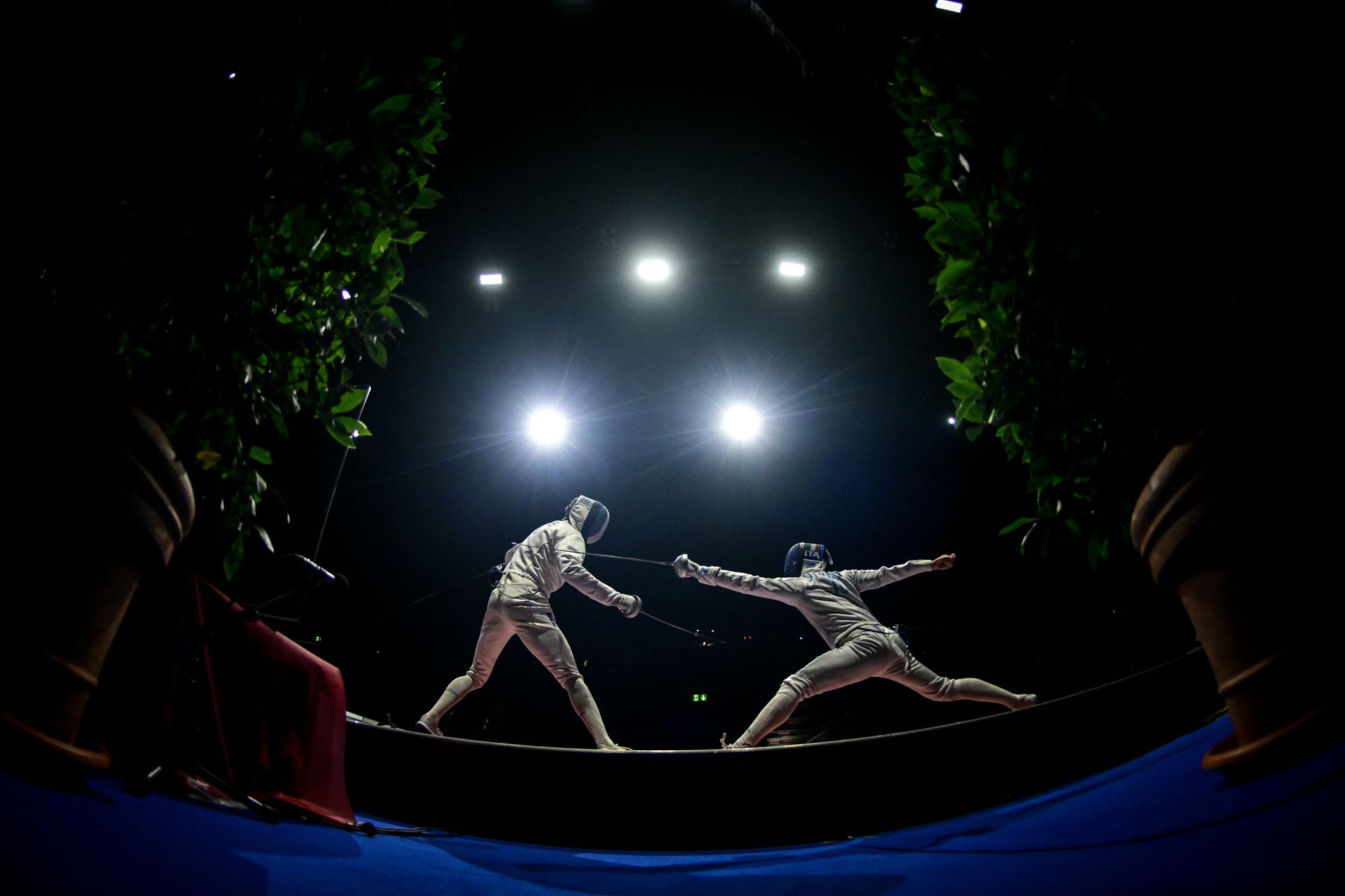 France's Paul Allegre (L ) competes with Italy's Davide Di Veroli (R) in the Euro Basel 2024 Fencing European Championship in Basel Switzerland , on June 22,2024. (Photo by Olivier Chassignole/AFP Photo)