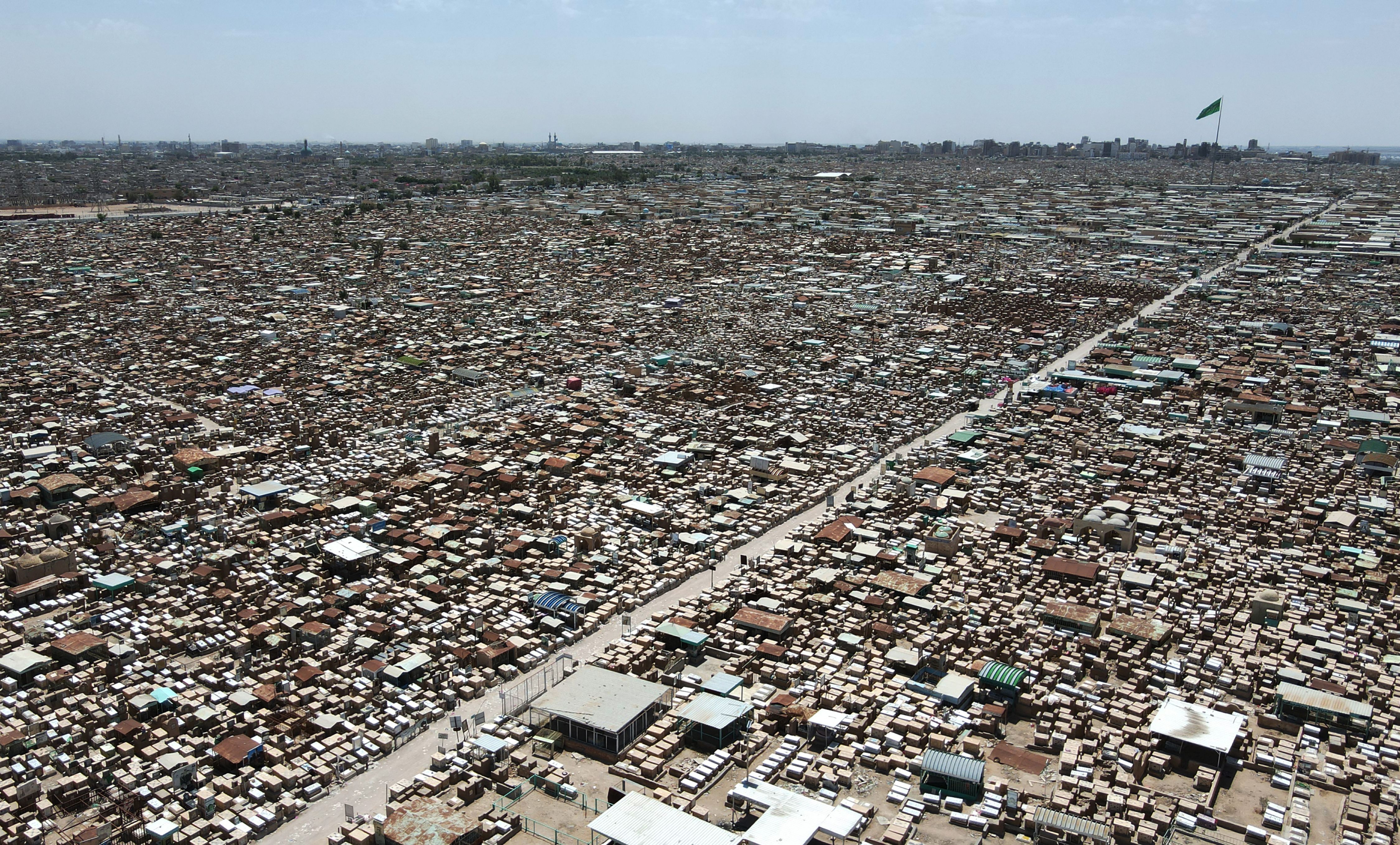 An aerial picture shows a view of the Wadi-al-Salam cemetery in Iraq's shrine city of Najaf on May 7, 2024. Wadi-al-Salam cemetery, often described as the world's biggest, is a sombre expanse of crypts, vaults and catacombs near the mausoleum of the revered Imam Ali, the founding figure of Shiite Islam, which bears silent witness to life and death over 14 centuries. (Photo by Ahmad Al-Rubaye/AFP Photo)