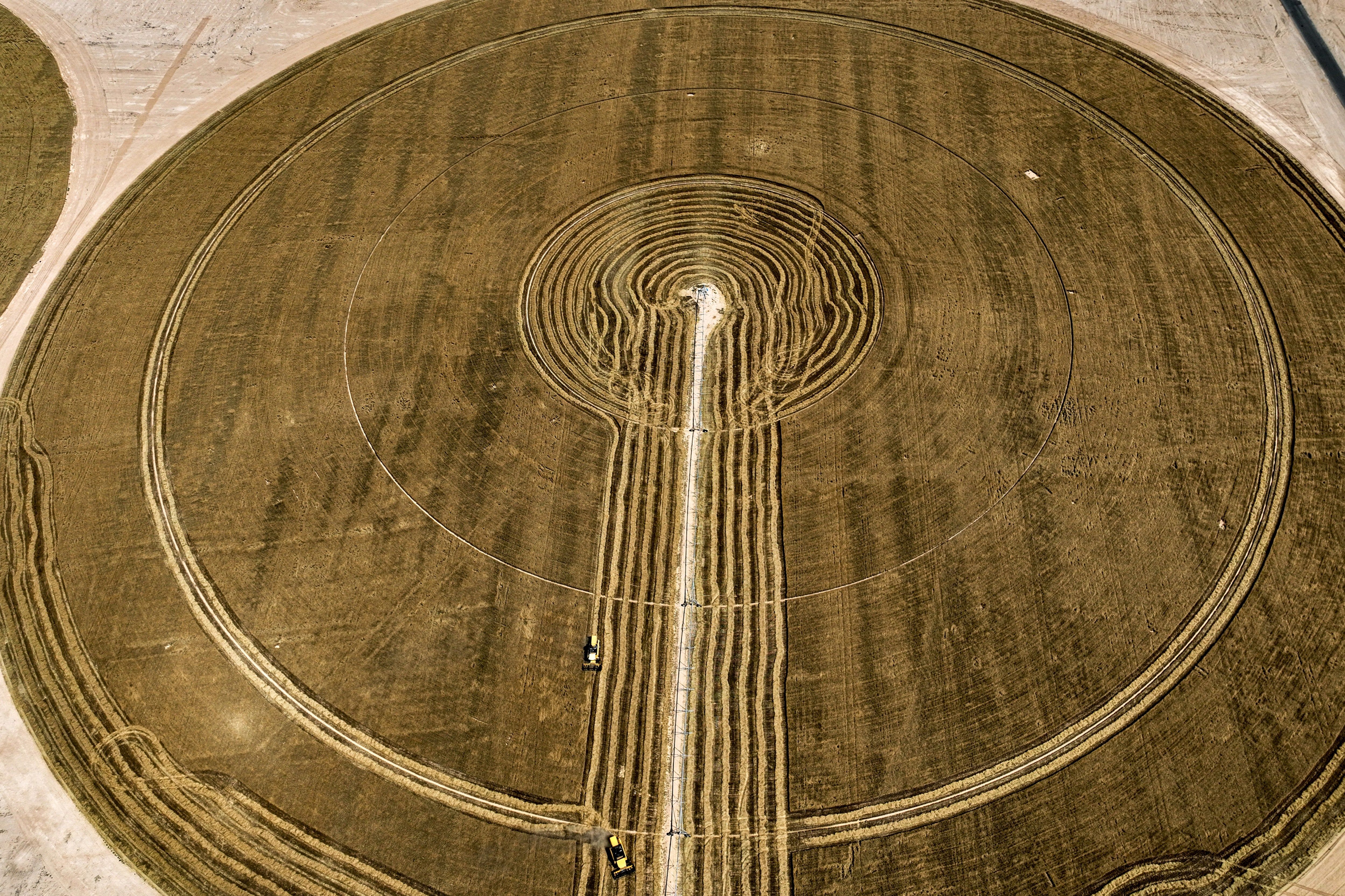 This aerial view shows harvesters operating in a centre-pivot irrigated wheat field in the Karbala Agricultural City megaproject, in reclaimed desert land about 40 kilometres south of Iraq's central city of Karbala on May 15, 2024, during the project's first wheat harvest season. (Photo by Ahmad Al-Rubaye/AFP Photo)