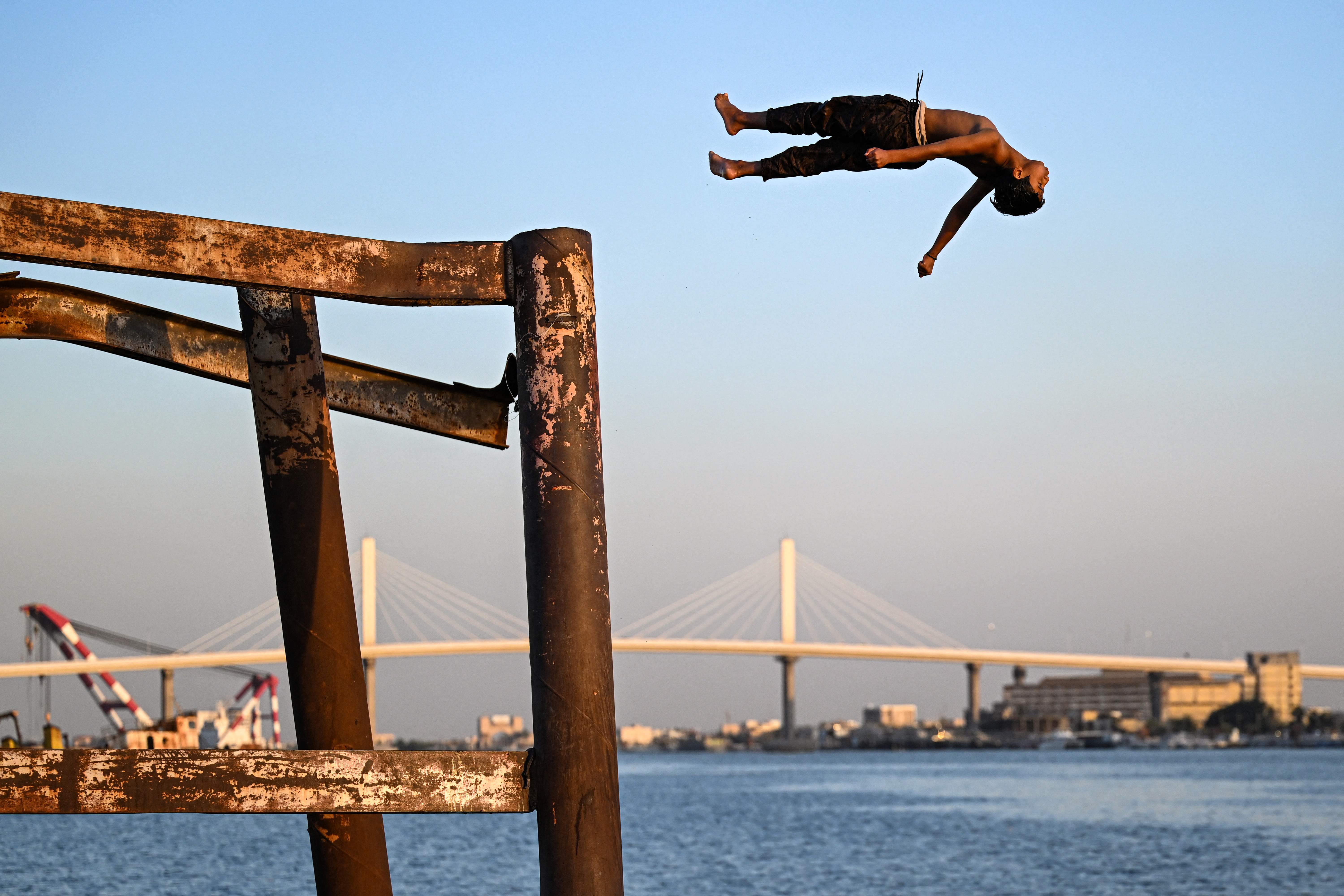 A youth dives in the Shatt al-Arab river, formed at the confluence of the Tigris and Euphrates rivers in southern Iraq, to cool off during a heatwave in Basra on June 4, 2024. (Photo by Hussein Faleh/AFP Photo)