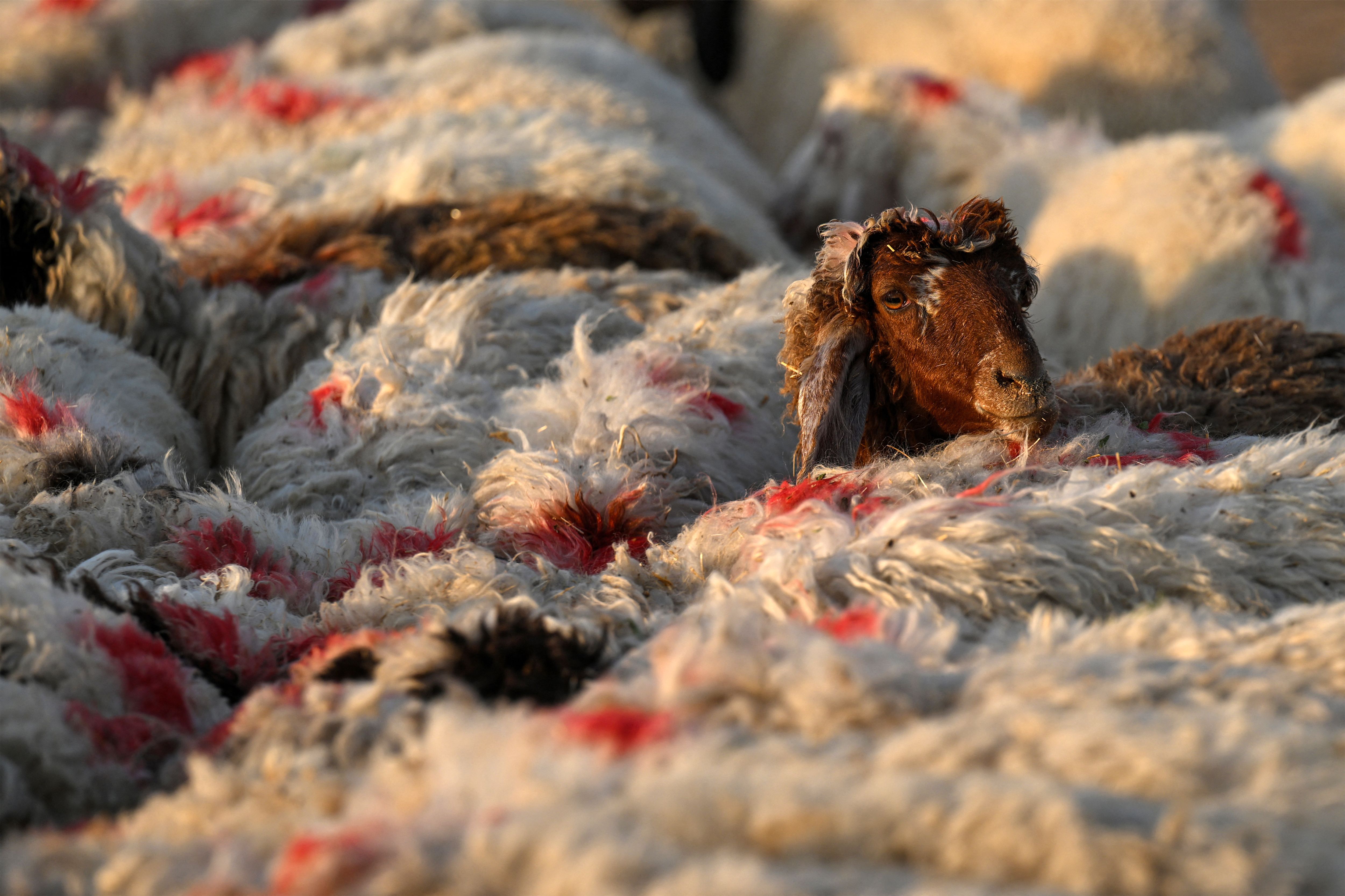 Sheep marked for sacrifice wait in an enclosure on the eve of the Muslim holiday of Eid al-Adha, or the Feast of Sacrifice, in Iraq's southern city of Basra on June 15, 2024. (Photo by Hussein Faleh/AFP Photo)