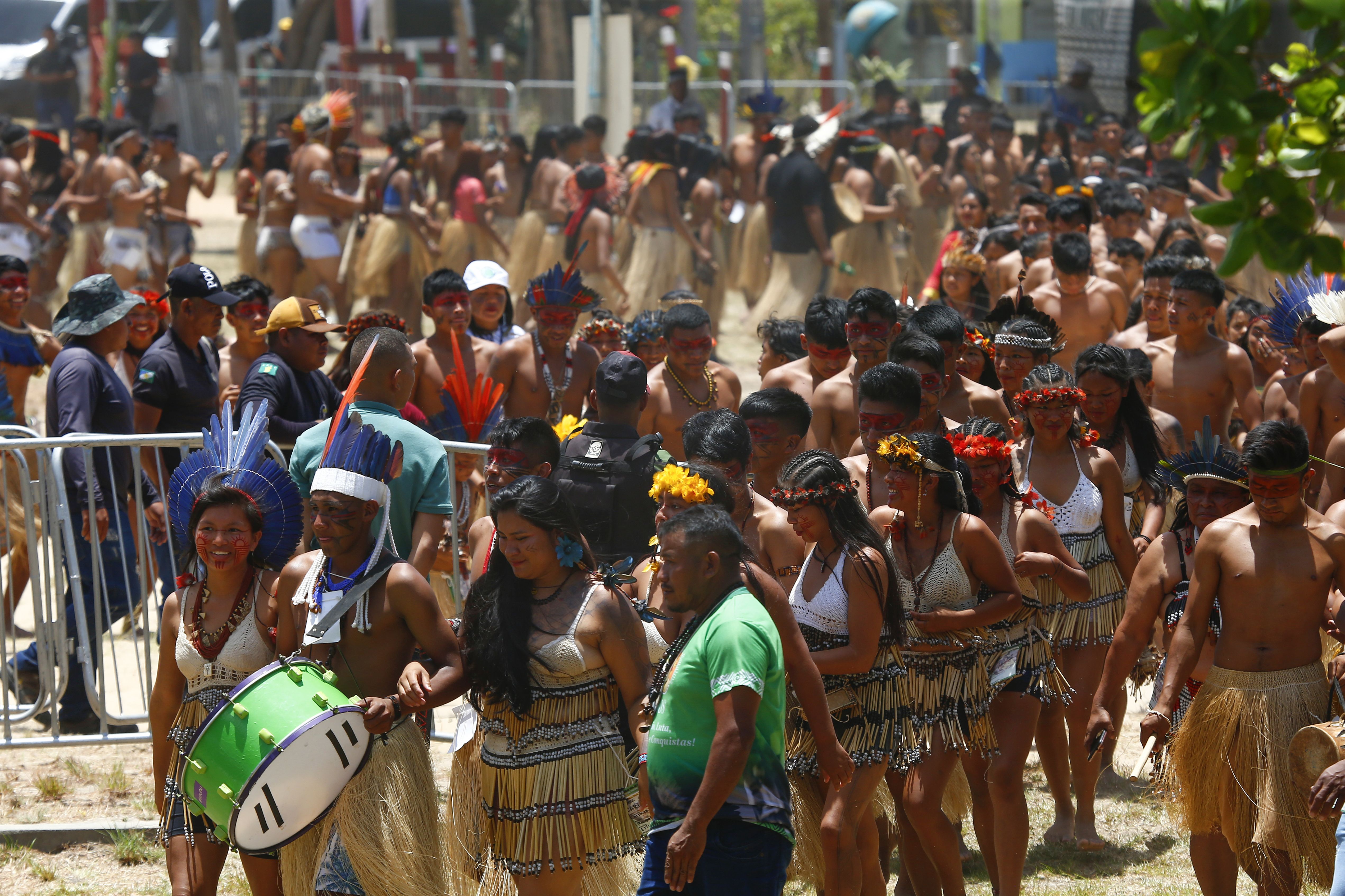 Indigenous people dance at the Caracarana Lake Regional Center in Normandia, on the Raposa Serra do Sol Indigenous reserve in Roraima state, Brazil, Monday, March 13, 2023. Hundreds of indigenous leaders from several ethnicities are meeting to discuss their rights, environment, sustainability, land demarcation and illegal mining. (Photo by Edmar Barros/AP Photo)