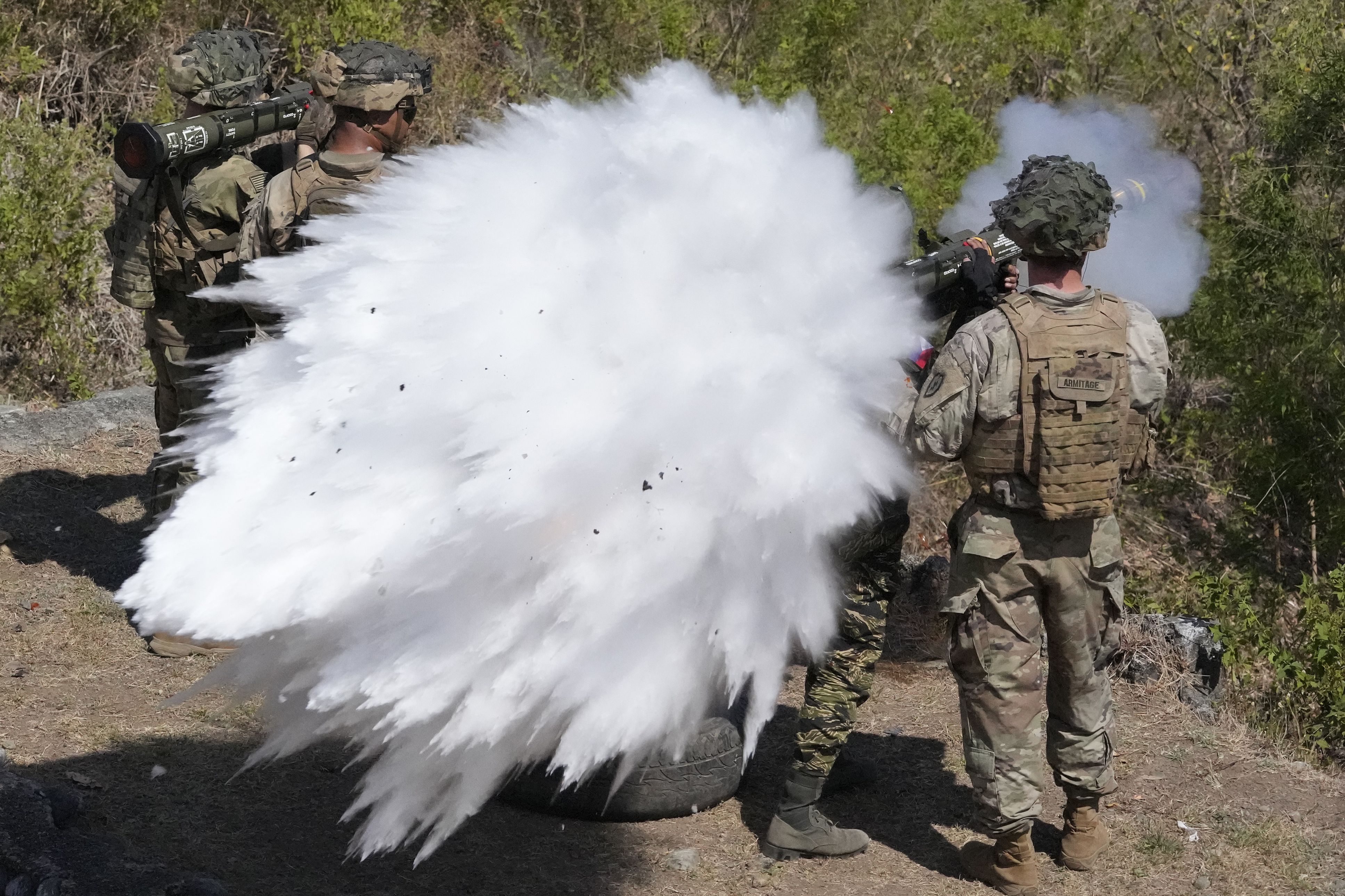 A Filipino soldier fires an AT-4 84mm anti-tank rocket with the guidance of a U.S. soldier during a joint military drill between the Philippines and the U.S. called Salaknib at Fort Magsaysay, Nueva Ecija province, northern Philippines on Friday, March 31, 2023. (Photo by Aaron Favila/AP Photo)