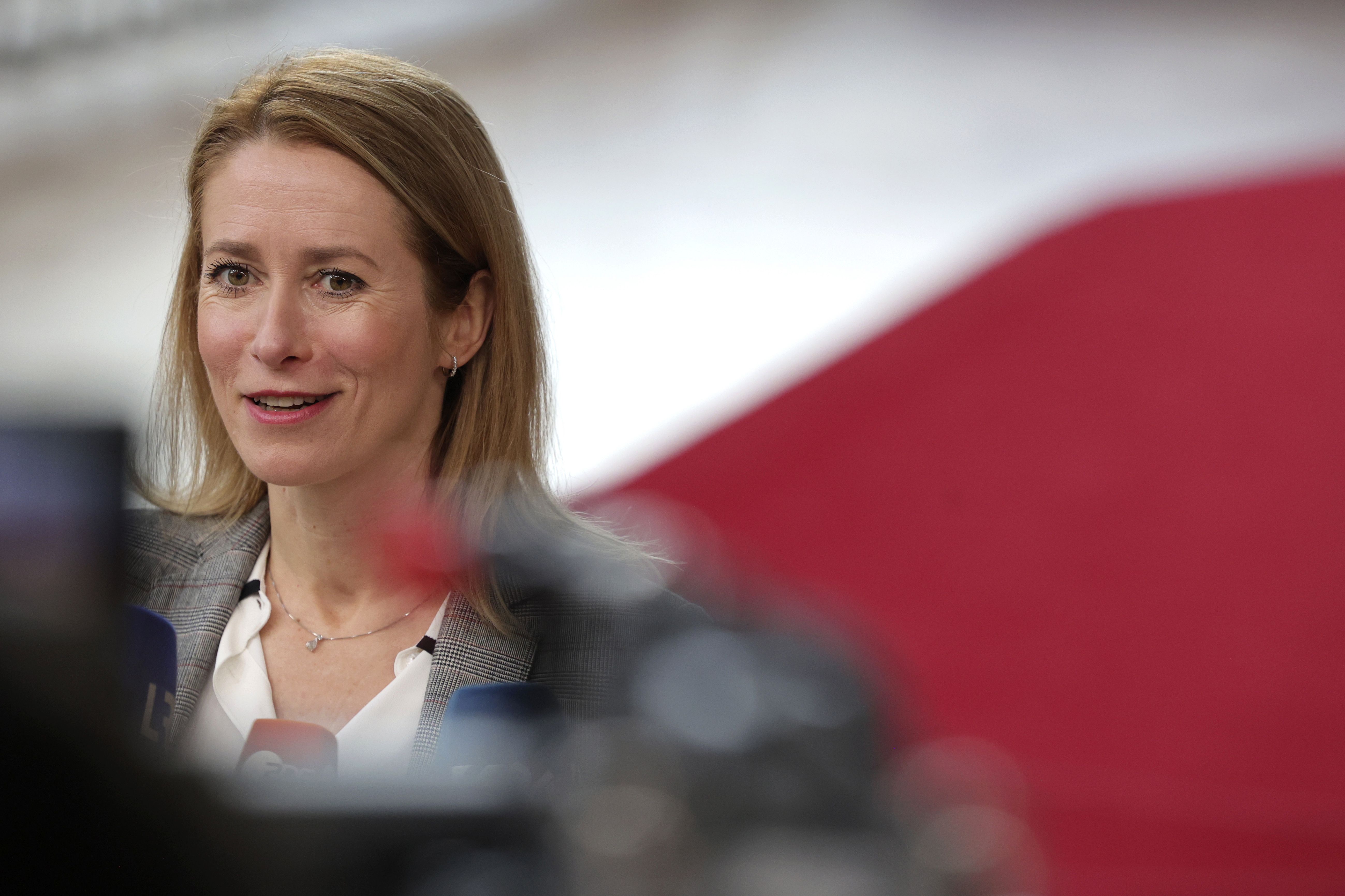 Estonia's Prime Minister Kaja Kallas speaks with the media as she arrives for an EU summit at the European Council building in Brussels, Friday, March 24, 2023. European leaders gather Friday to discuss economic and financial challenges and banking rules, seeking to tamp down concerns about eventual risks for European consumers from banking troubles in the US and Switzerland. (Photo by Olivier Matthys/AP Photo)