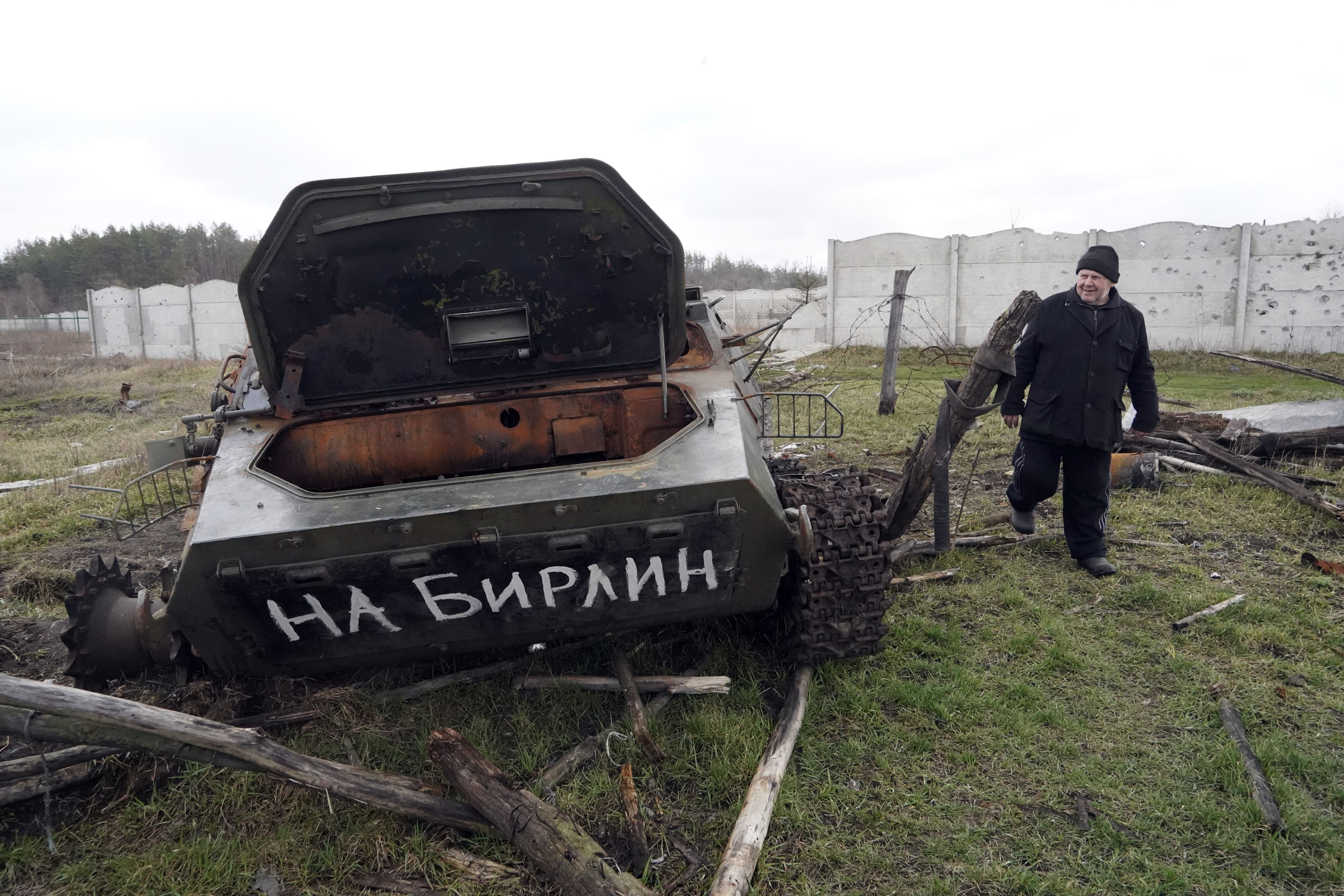 A local man walks past a destroyed Russian armoured vehicle with writing reading “towards Berlin” in liberated village Ruski Tyshky, Ukraine, Monday, March 27, 2023. After the winter, many residents of the liberated territories of the Kharkiv region return home to rebuild their homes after the fighting between the Russian and Ukrainian armed forces. (Photo by Andrii Marienko/AP Photo)