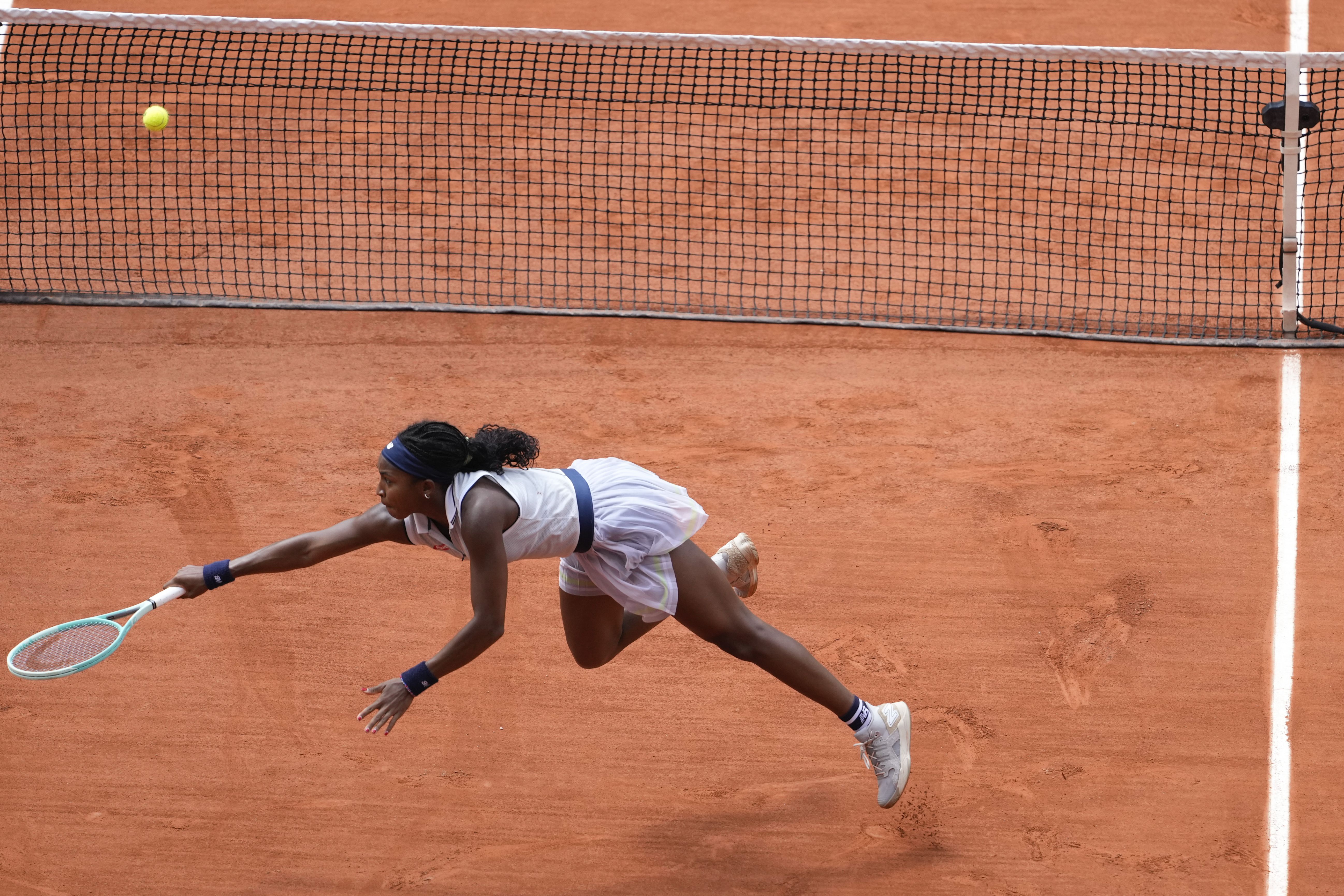 Coco Gauff of the U.S. plays a shot against Tunisia's Ons Jabeur during their quarterfinal match of the French Open tennis tournament at the Roland Garros stadium in Paris, Tuesday, June 4, 2024. (Photo by Thibault Camus/AP Photo)
