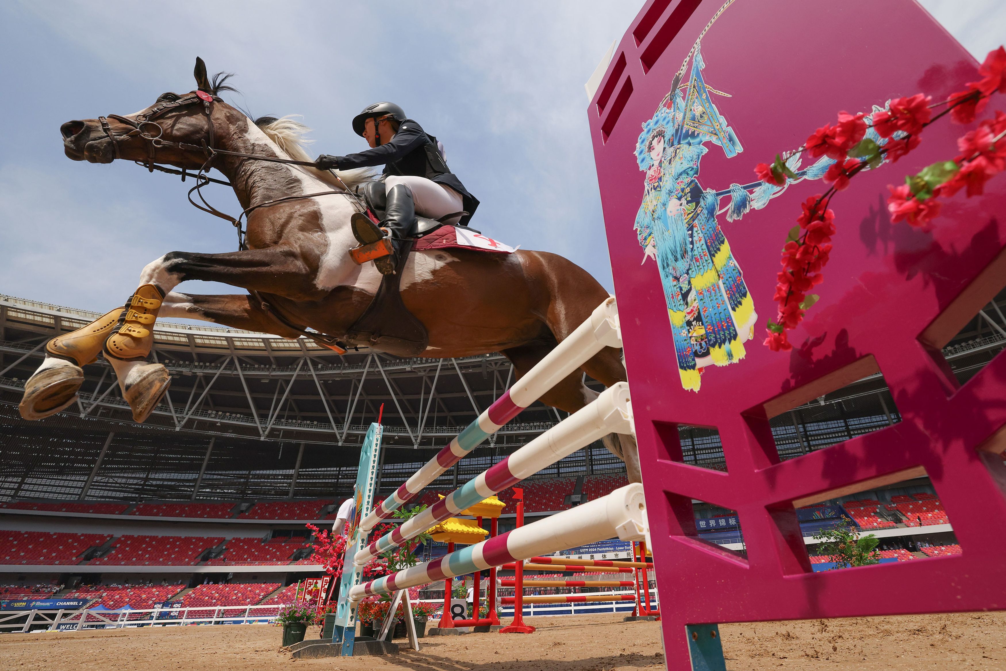 Seungmin Seong of South Korea competes in the Riding Show Jumping during the Women's Team relay pentathlon Medal Ceremony of UIPM 2024 Pentathlon World Championships at Zhengzhou Olympic Sports Center on June 10, 2024 in Zhengzhou, China. (Photo by Lintao Zhang/Getty Images)