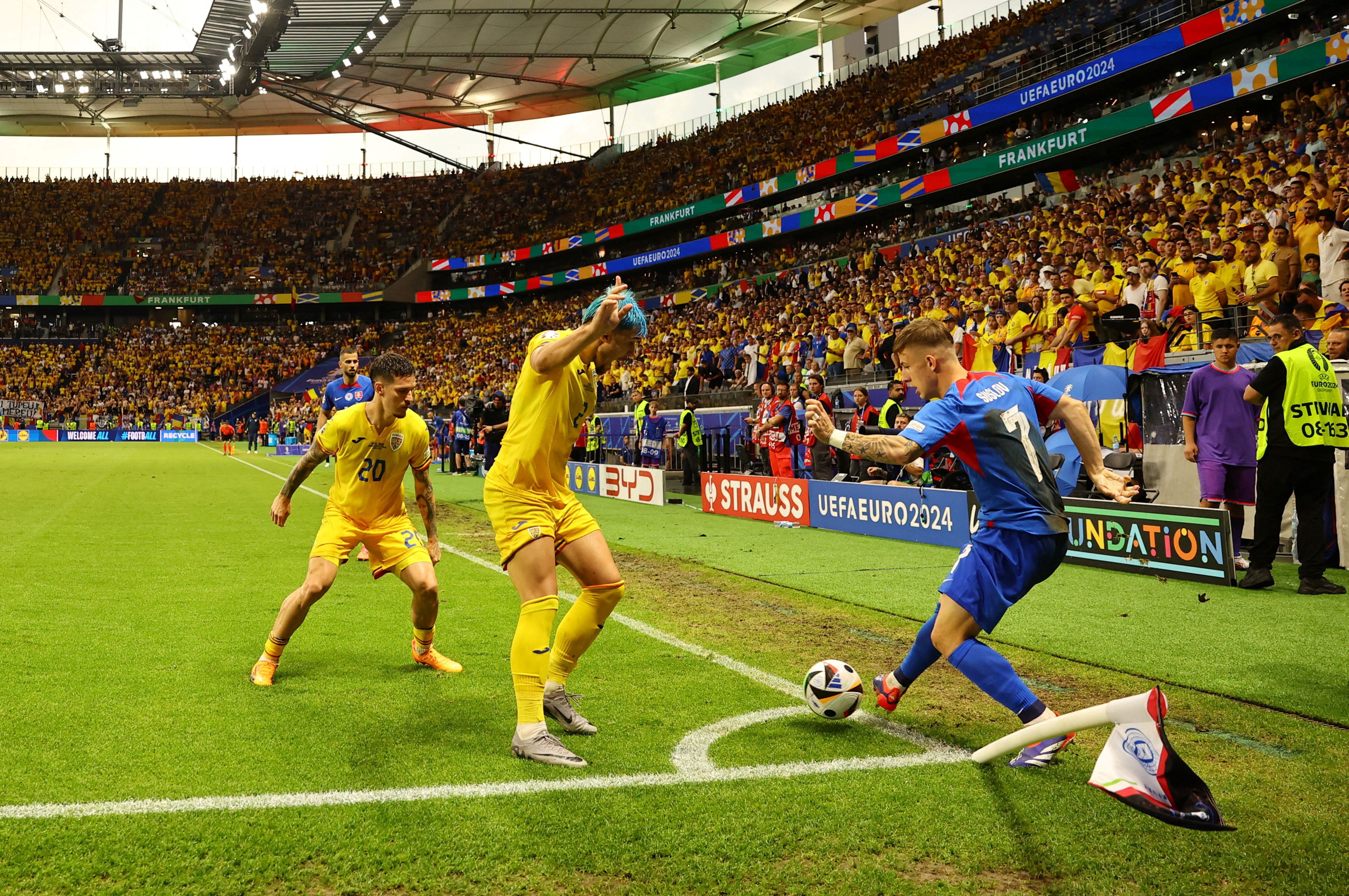 Slovakia's Tomas Suslov in action with Romania's Andrei Ratiu during their Euro match in Frankfurt, Germany on June 26, 2024. (Photo by Kai Pfaffenbach/Reuters)
