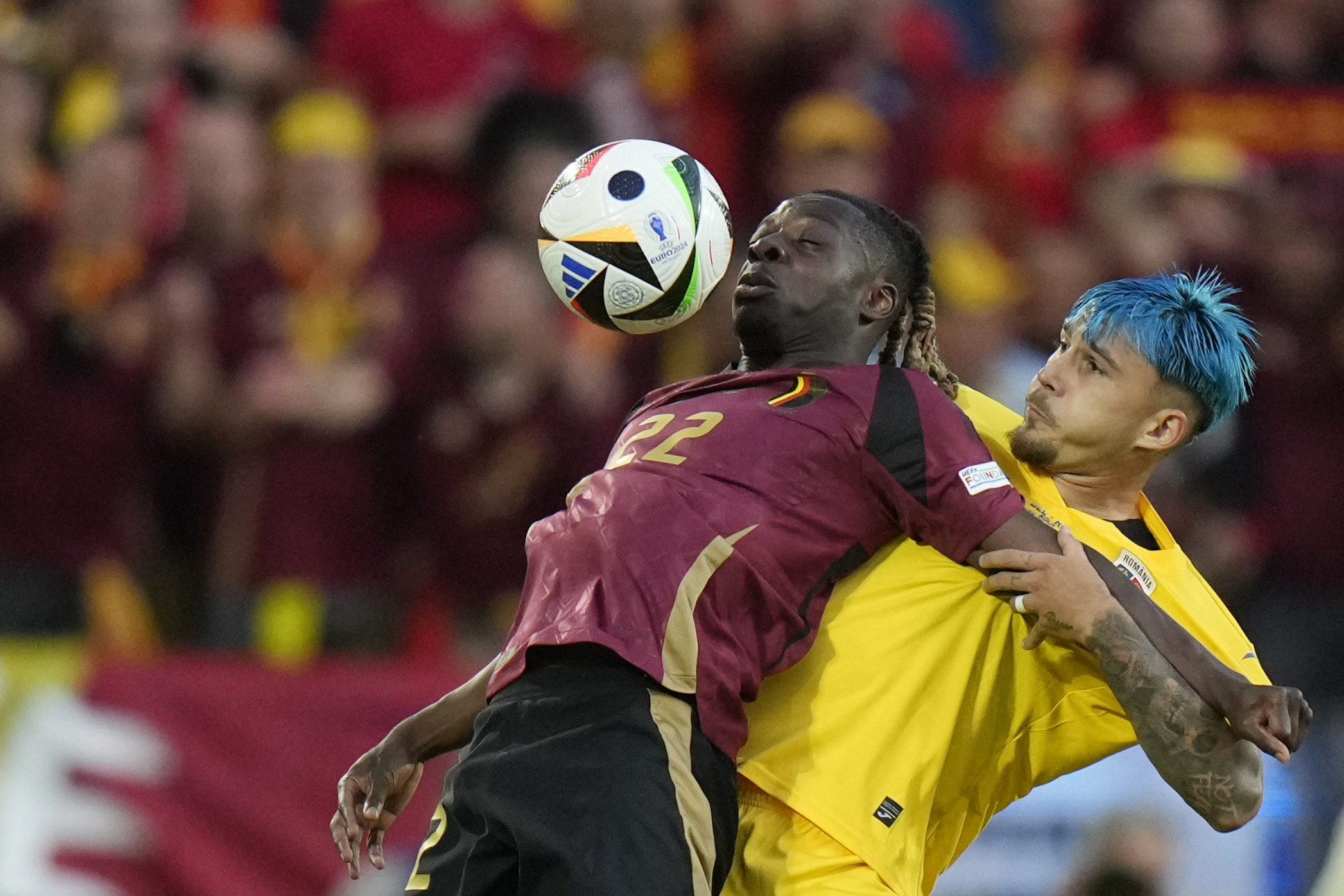 Belgium's Jeremy Doku, left, challenges for the ball with Romania's Andrei Ratiu during a Group E match between Belgium and Romania at the Euro 2024 soccer tournament in Cologne, Germany, Saturday, June 22, 2024. (Photo by Alessandra Tarantino/AP Photo)