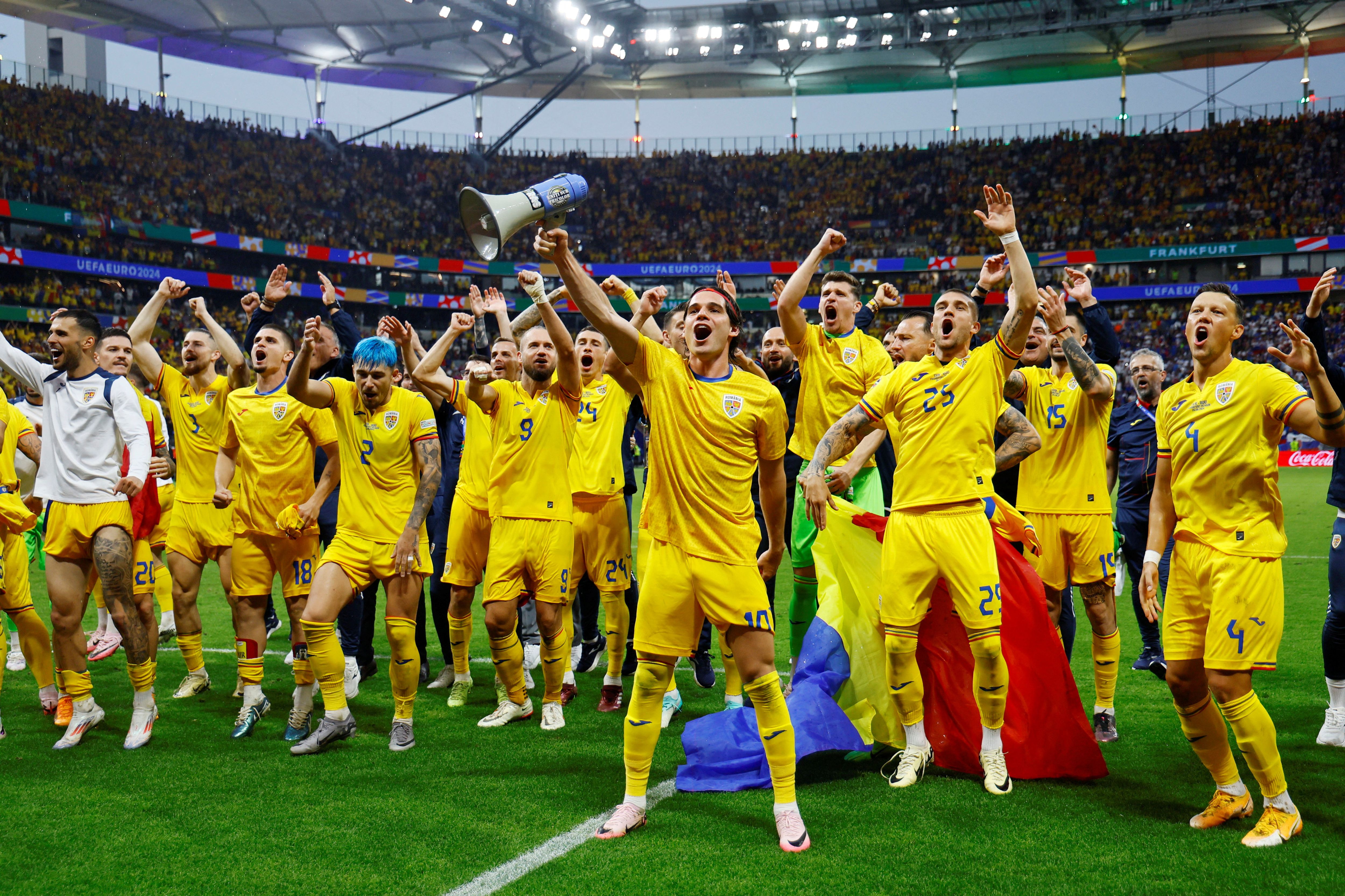 Romania's Ianis Hagi and teammates celebrate with their fans after their Euro match against Slovakia in Frankfurt, Germany on June 26, 2024. (Photo by Wolfgang Rattay/Reuters)