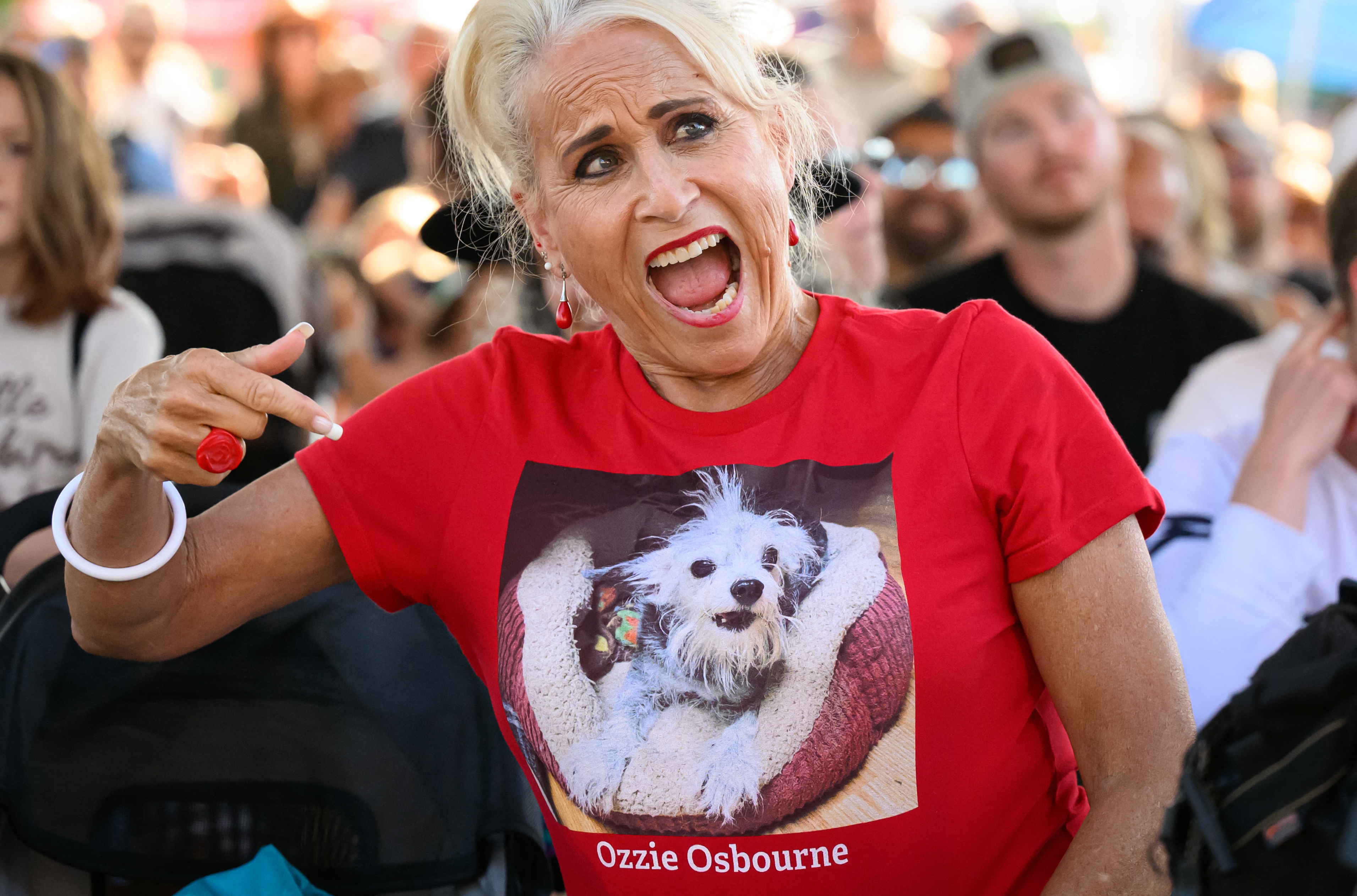 Lori Rooney, wearing a t-shirt of ugly dog Ozzie Osbourne, cheers during the annual World's Ugliest Dog contest at the Sonoma-Marin Fair in Petaluma, California, on June 21, 2024. Wild Thang, a Pekingese dog who had already entered the competition four times, finally won the 34th annual World's Ugliest Dog competition and was awarded $5,000. (Photo by Josh Edelson/AFP Photo)