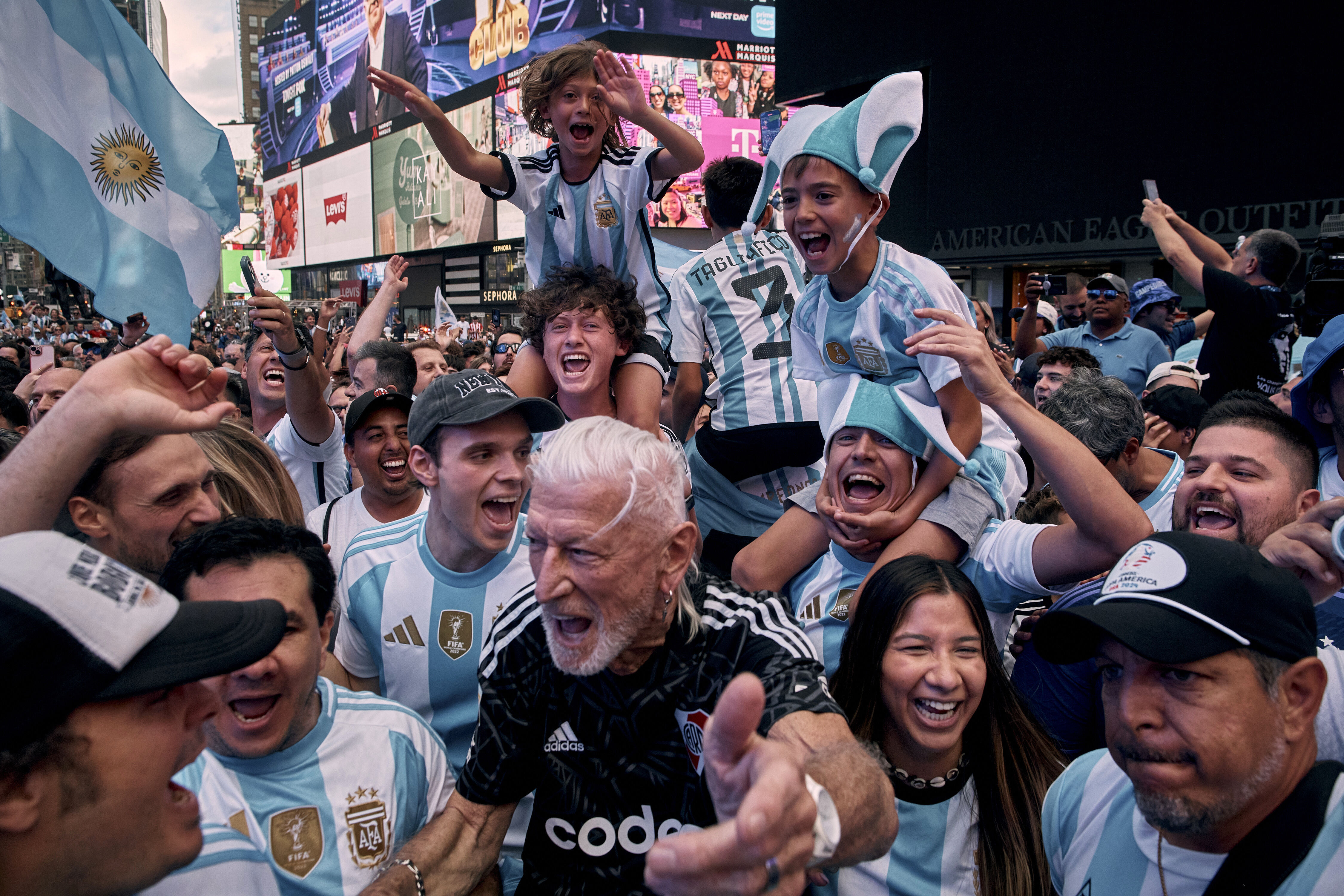 Argentina fans sing as they gather in Times Square to support the Argentina national soccer team Monday, June 24, 2024, in New York. Argentina is scheduled to face Chile, Tuesday in a Copa America soccer match. (Photo by Andres Kudacki/AP Photo)