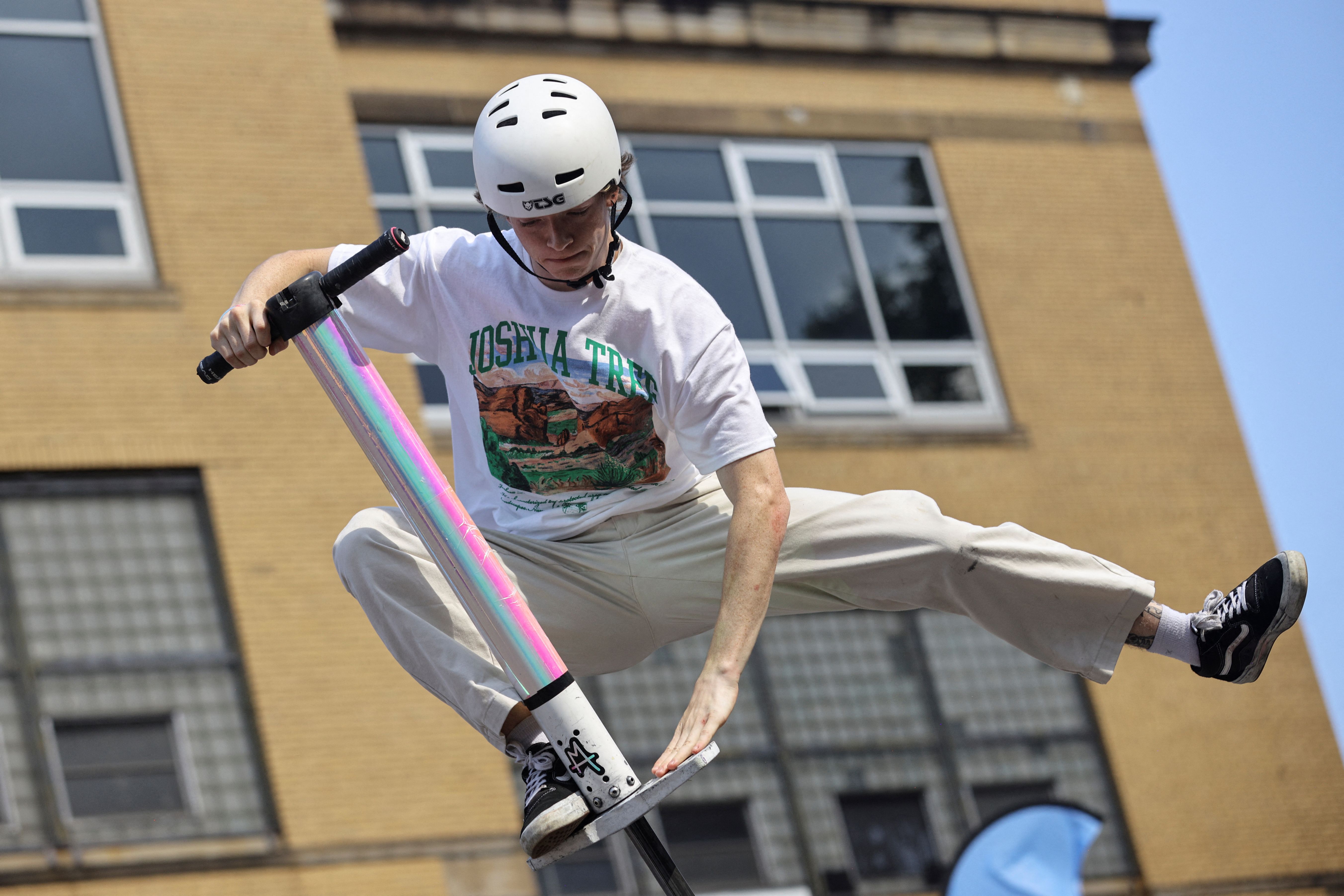 A competitor participates in the World Championships of Pogo during a heat wave in Pittsburgh, Pennsylvania on June 22, 2024. (Photo by Quinn Glabicki/Reuters)